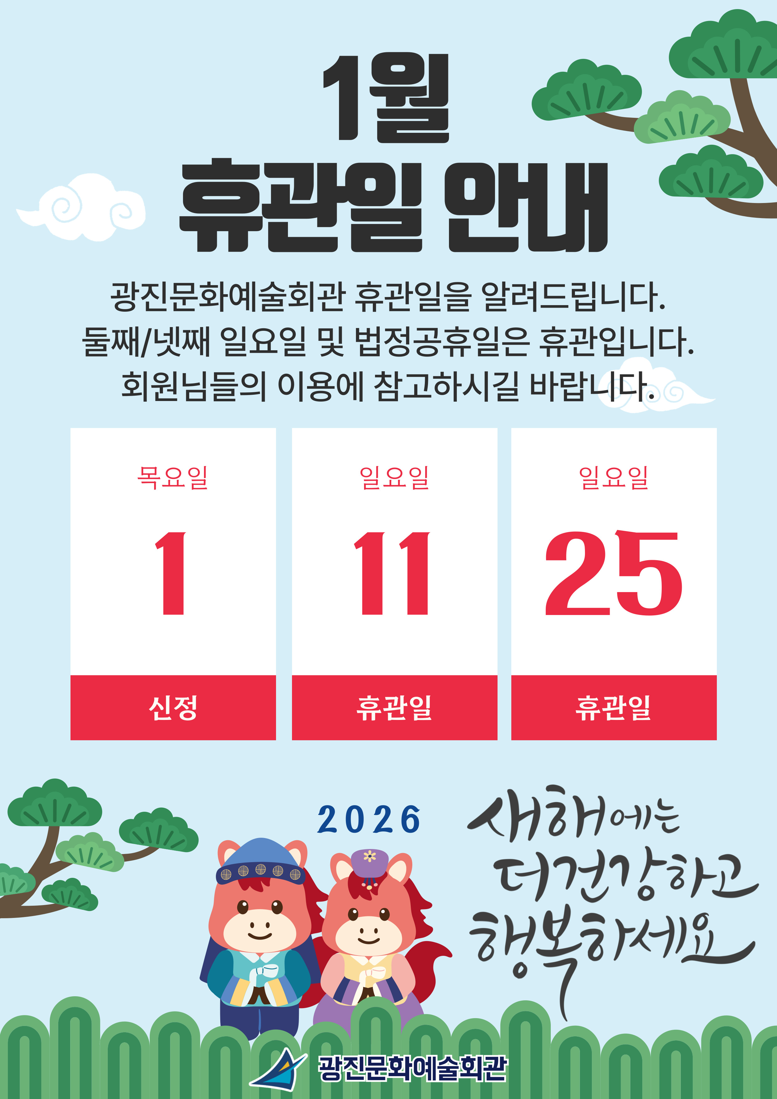 공지 광진문화예술회관 [광진문화예술회관] 1월 휴관일 안내 작성자 문화체육부 등록일자 2026년 1월 5일 16시 23분 4초 조회 288 📢 1월 휴관일 안내광진문화예술회관 휴관일을 알려드립니다.둘째·넷째 일요일 및 법정공휴일은 휴관입니다.회원 여러분의 이용에 참고하시기 바랍니다.자세한 내용은 첨부파일을 참고해주세요. 휴관일_접수일정-028.jpg [ Size : 804.51KB , Down : 139 ] 미리보기 다운로드 목록보기