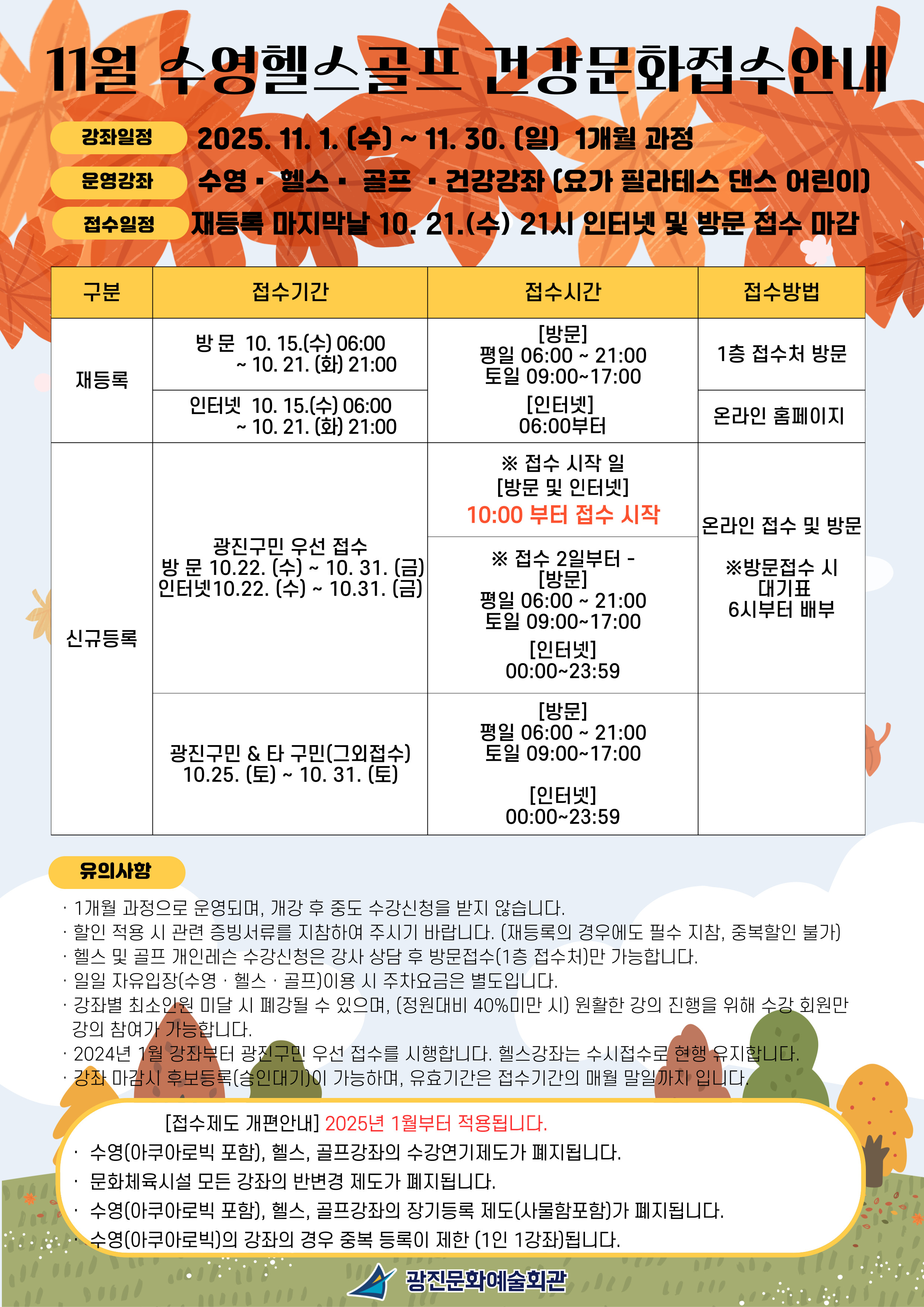 공지 광진문화예술회관 [광진문화예술회관] 11월 수영/골프/헬스/건강문화 강좌 접수 일정 안내
