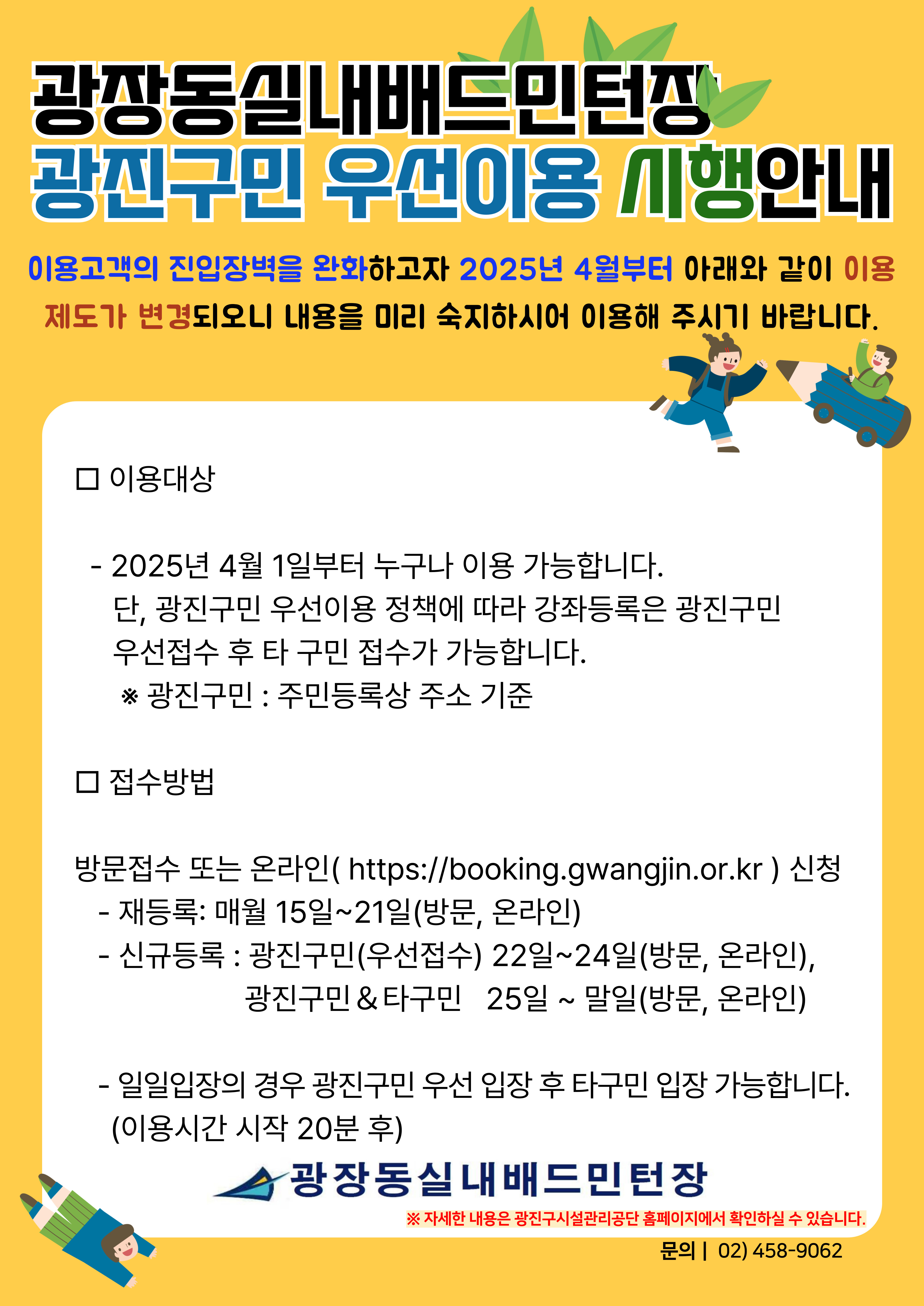 공지 광장동실내배드민턴장 광진구민 우선 접수(이용) 시행 안내