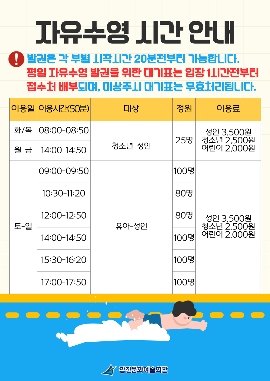 공지 광진문화예술회관 [광진문화예술회관] 자유수영 이용 안내(현재)