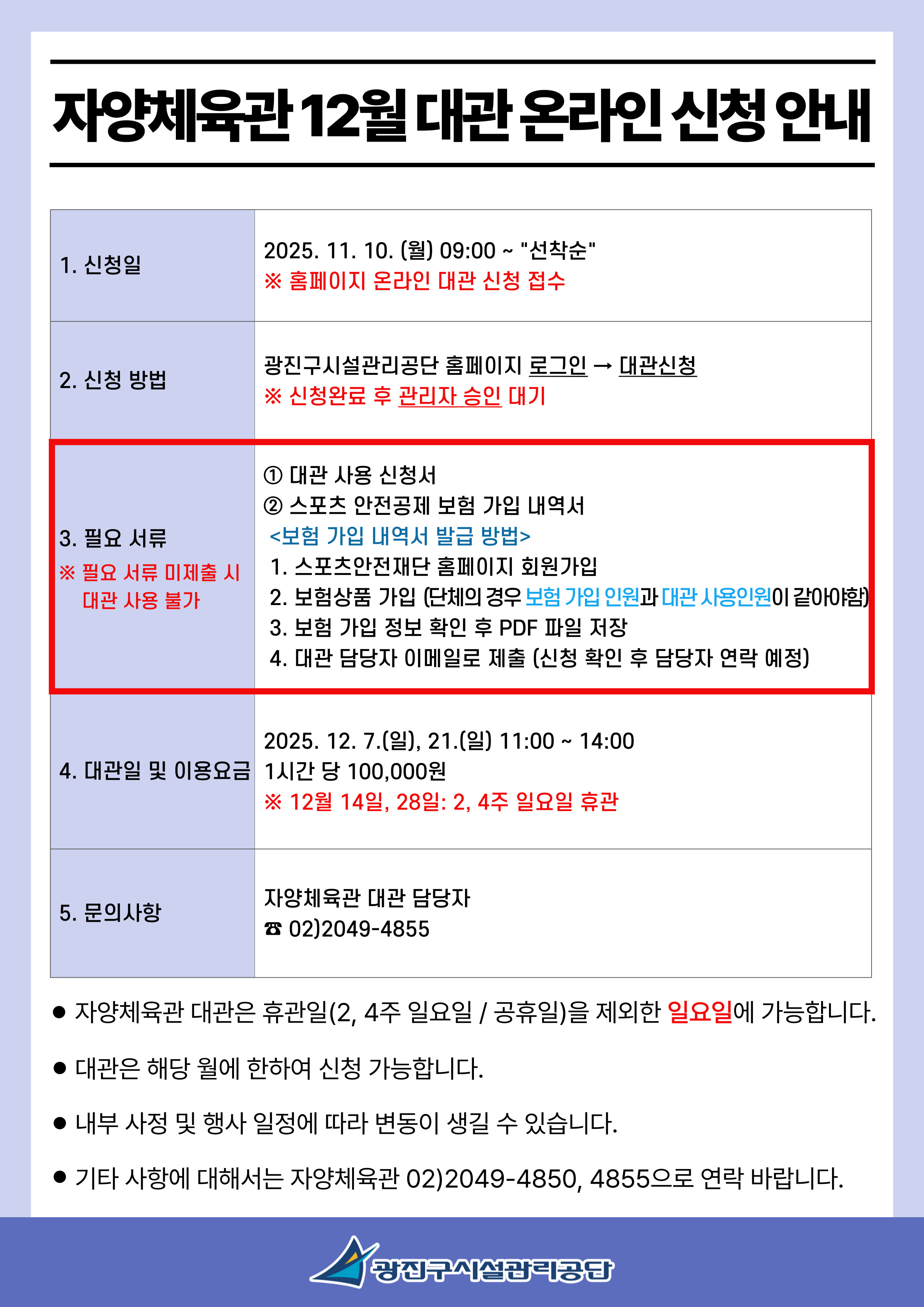 공지 자양체육관 [자양체육관] 12월 대관 온라인 신청 안내