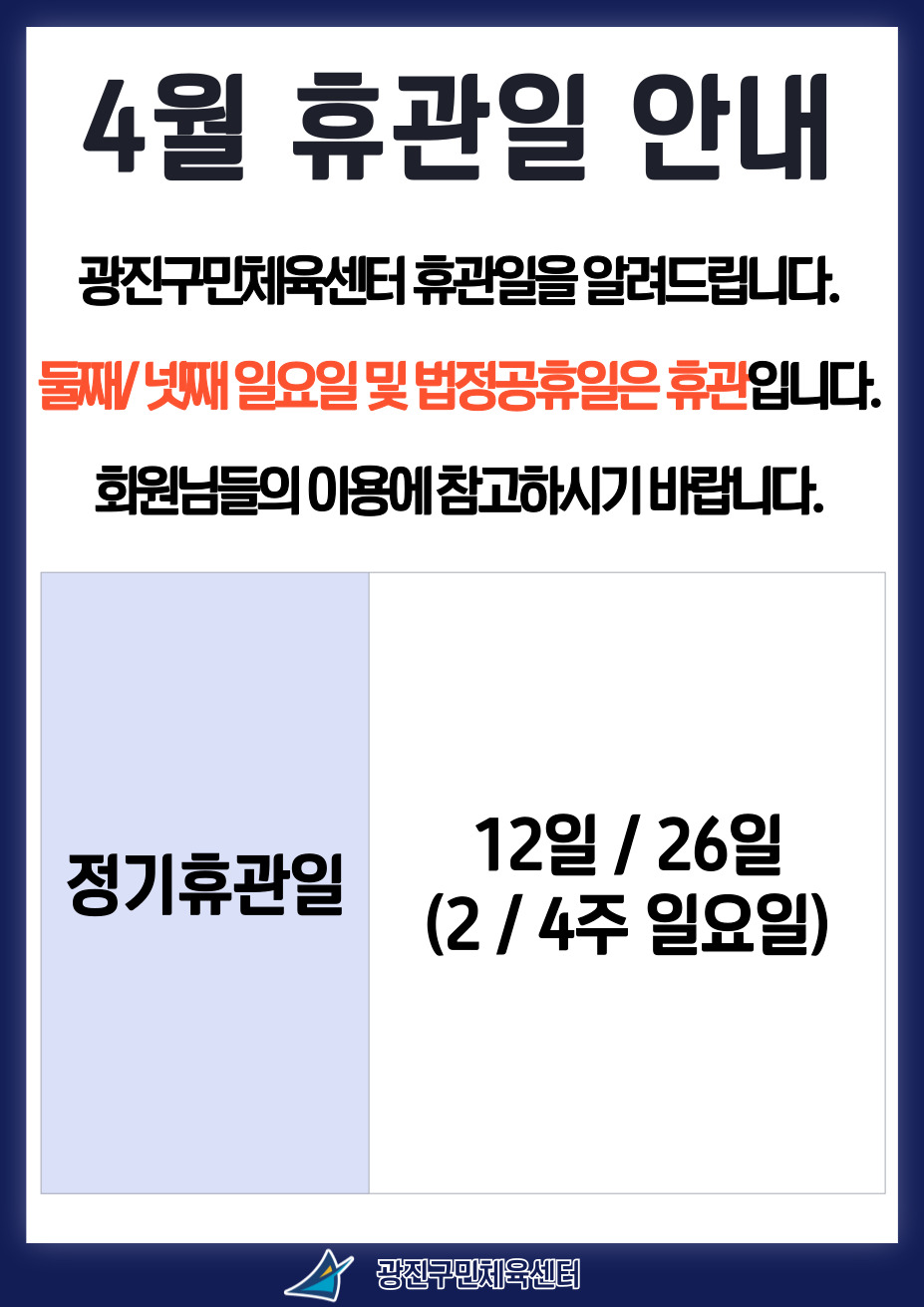 광진구민체육센터 [광진구민체육센터] 4월 휴관일 안내 작성자 이혜연 등록일자 2026년 3월 30일 16시 20분 4초 조회 111 광진구민체육센터 휴관일을 알려드립니다.둘째/넷째 일요일 및 법정공휴일은 휴관입니다.회원님들의 이용에 참고하시기 바랍니다.정기휴관일 : 12일 / 26일 (2/4주 일요일)"자세한 내용은 첨부 파일을 참고해 주세요." 휴관일.jpg [ Size : 173.35KB , Down : 37 ] 미리보기 다운로드 목록보기