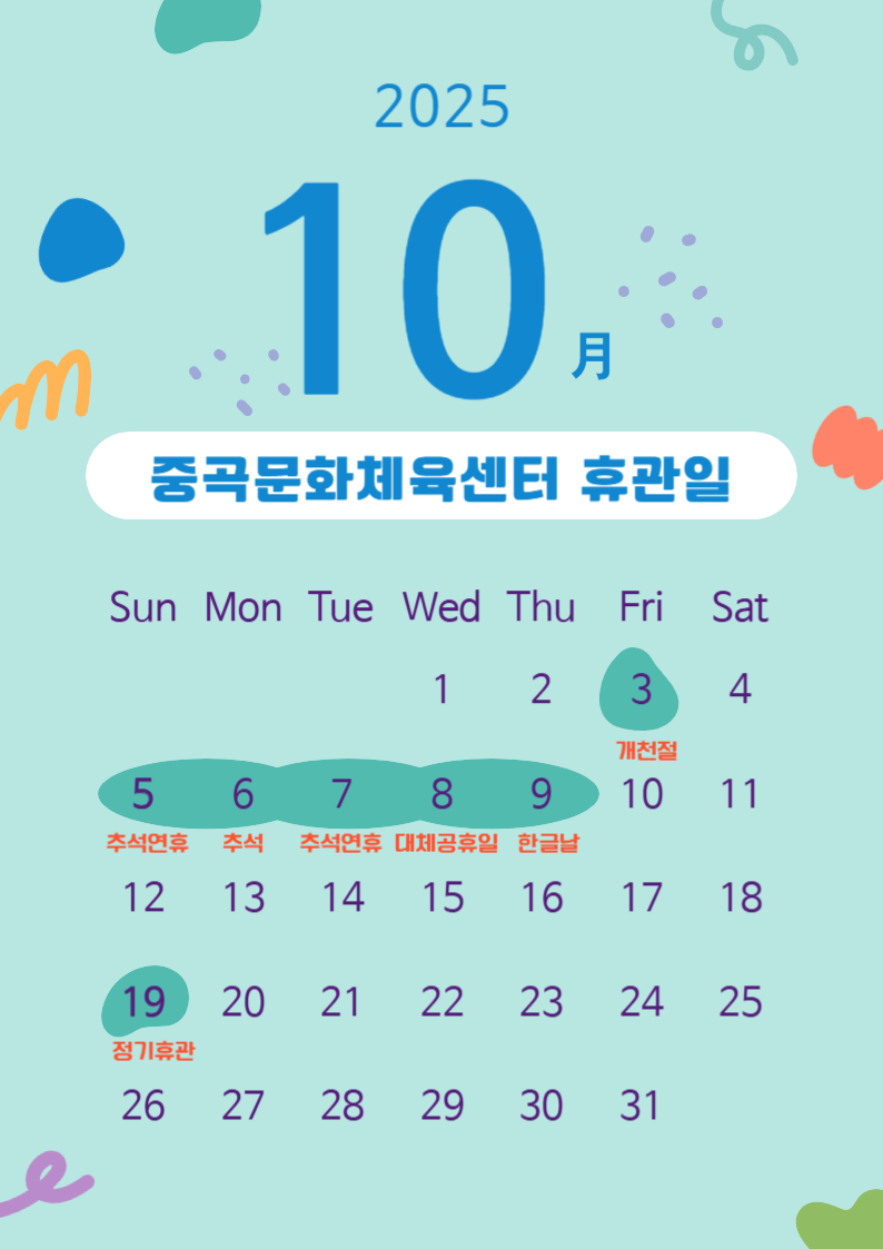 공지 중곡문화체육센터 [중곡문화체육센터] 10월 휴관일 안내 작성자 최유리 등록일자 2025년 9월 12일 15시 28분 17초 조회 1,373 중곡문화체육센터 10월 휴관일 안내입니다.10월 3일 개천절, 10월 5일 ~ 7일 추석연휴이며, 8일 대체 공휴일, 9일 한글날이며, 10월 19일은 정기휴관 입니다. 이용에 참고하시 바랍니다."자세한 내용은 첨부 파일을 참고해 주세요." 중곡문화체육센터 10월 휴관일.png [ Size : 147.75KB , Down : 1,366 ] 미리보기 다운로드 목록보기