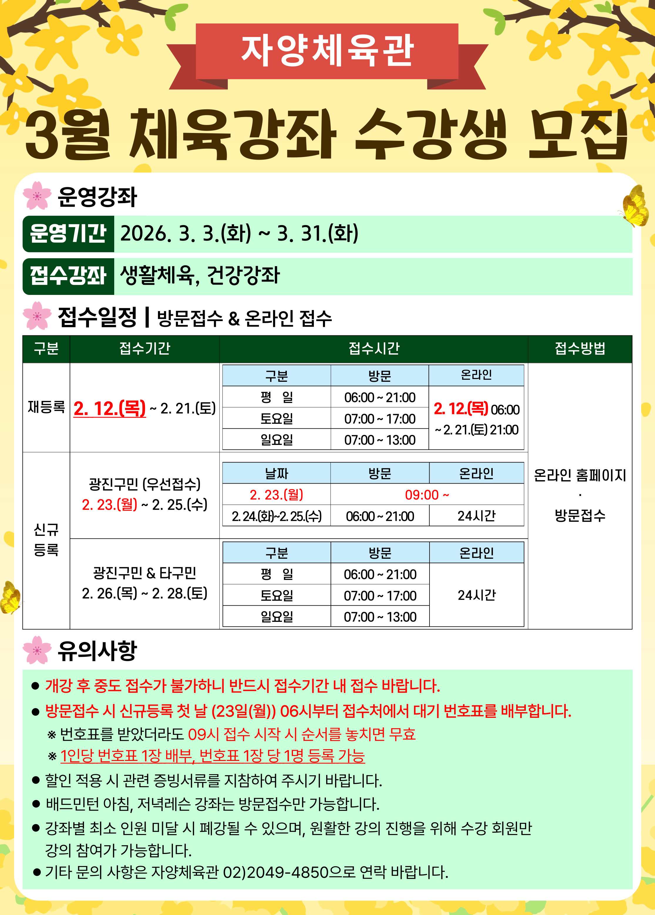 자양체육관 [자양체육관] 3월 생활체육, 건강강좌 접수 일정 안내(★ 재등록 2월 12일부터)