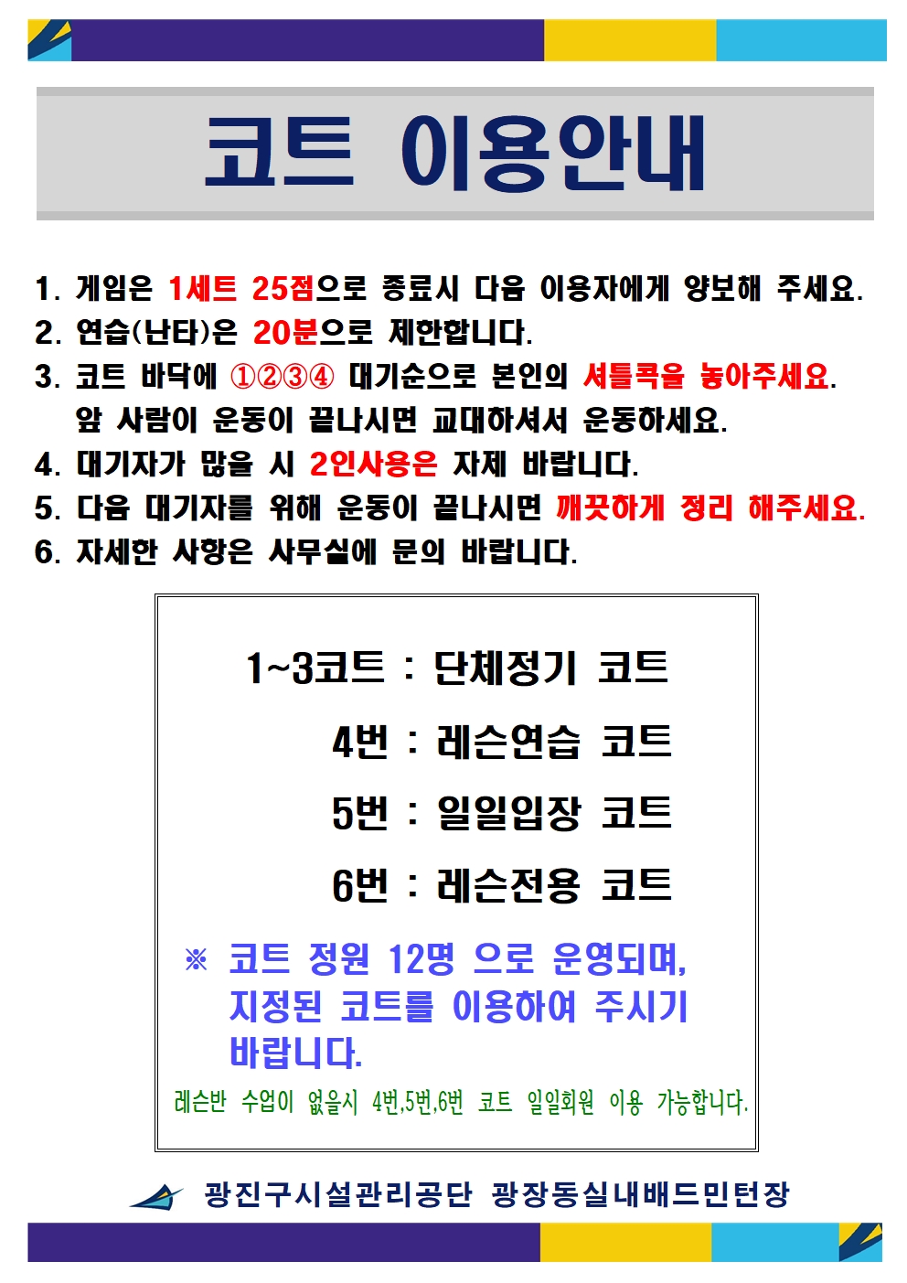 ※ 코트 정원 12명 으로 운영되며, 지정된 코트를 이용하여 주시기 바랍니다.
