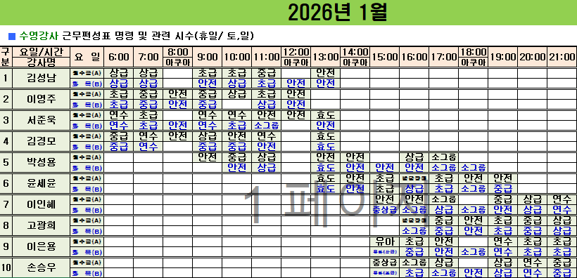 중곡문화체육센터 [중곡문화체육센터] 2026년 상반기 수영강사 레인 편성표 작성자 최유리 등록일자 2025년 12월 30일 13시 25분 23초 조회 128 [중곡문화체육센터] 수영강사 레인 편성표 안내입니다.2026년 상반기(1월~6월) 수영강세 레인 편성표를 첨부하오니, 자세한 내용은 첨부파일을 참고해 주시기 바랍니다. 2026.1. 수영장 근무표.png [ Size : 38.38KB , Down : 79 ] 미리보기 다운로드 목록보기