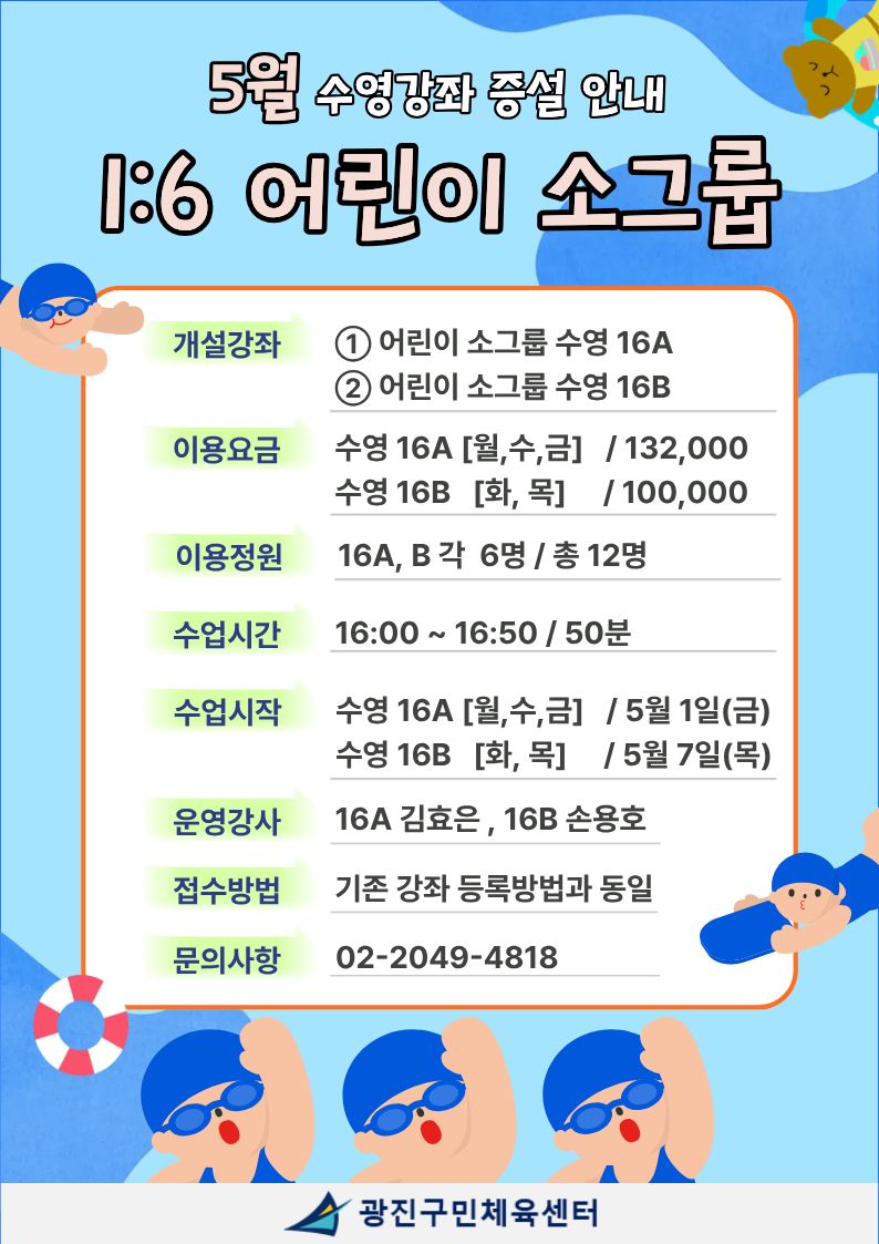 공지 광진구민체육센터 [광진구민체육센터] 1:6 어린이소그룹 증설 안내 작성자 이혜연 등록일자 2026년 4월 1일 15시 57분 40초 조회 97 1:6 어린이 소그룹 수영교실 16A / 16B 증설 안내"자세한 내용은 첨부 파일을 참고해 주세요." 증설안내.jpg [ Size : 127.25KB , Down : 47 ] 미리보기 다운로드 목록보기