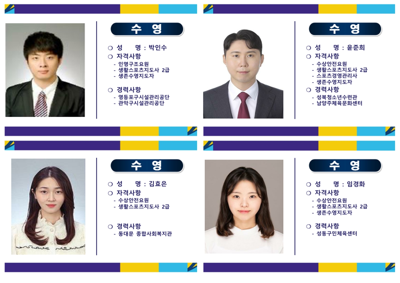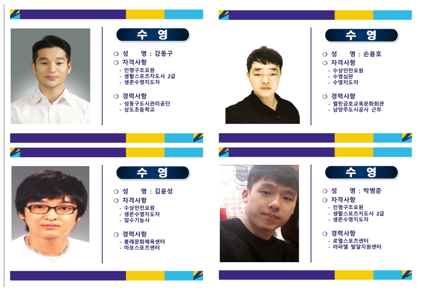 성명 : 김윤성 / 자격사항 : 수상안전요원, 생존수영지도자, 잠수기능사 / 경력사항 : 봉래문화체육센터, 마포스포츠센터