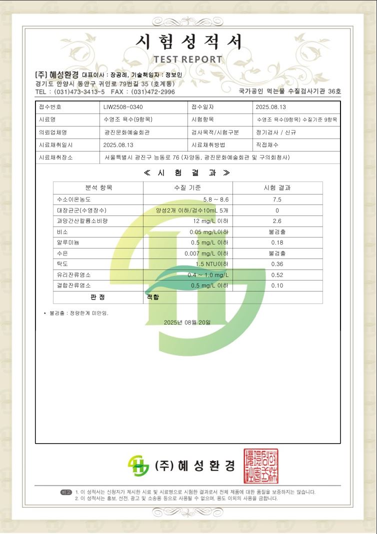 공지 광진문화예술회관 [광진문화예술회관] 2025년 3분기 수영장 수질검사 시험성적서 작성자 문화체육부 등록일자 2025년 8월 21일 14시 57분 29초 조회 515 2025년 3분기 광진문화예술회관 수영장 수질검사 시험성적서 입니다.자세한 내용은 첨부파일을 참고 바랍니다. 시험성적서.JPG [ Size : 111.08KB , Down : 213 ] 미리보기 다운로드 목록보기