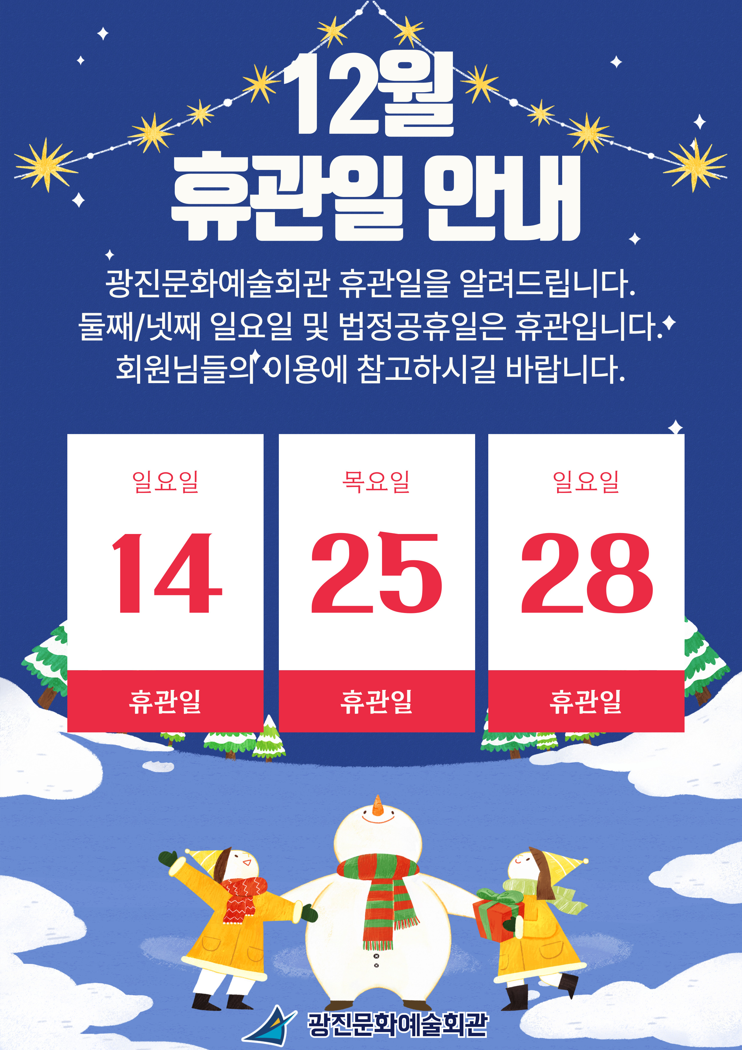 공지 광진문화예술회관 [광진문화예술회관] 12월 휴관일 안내 작성자 문화체육부 등록일자 2025년 11월 20일 10시 55분 22초 조회 693 📢 12월 휴관일 안내광진문화예술회관 휴관일을 알려드립니다.둘째·넷째 일요일 및 법정공휴일은 휴관입니다.회원 여러분의 이용에 참고하시기 바랍니다.12월 휴관일은 아래와 같습니다.12월 14일(일)12월 25일(목) — 성탄절12월 28일(일)자세한 내용은 첨부파일을 참고해주세요. 휴관일_접수일정-020.jpg [ Size : 1.7MB , Down : 86 ] 미리보기 다운로드 목록보기
