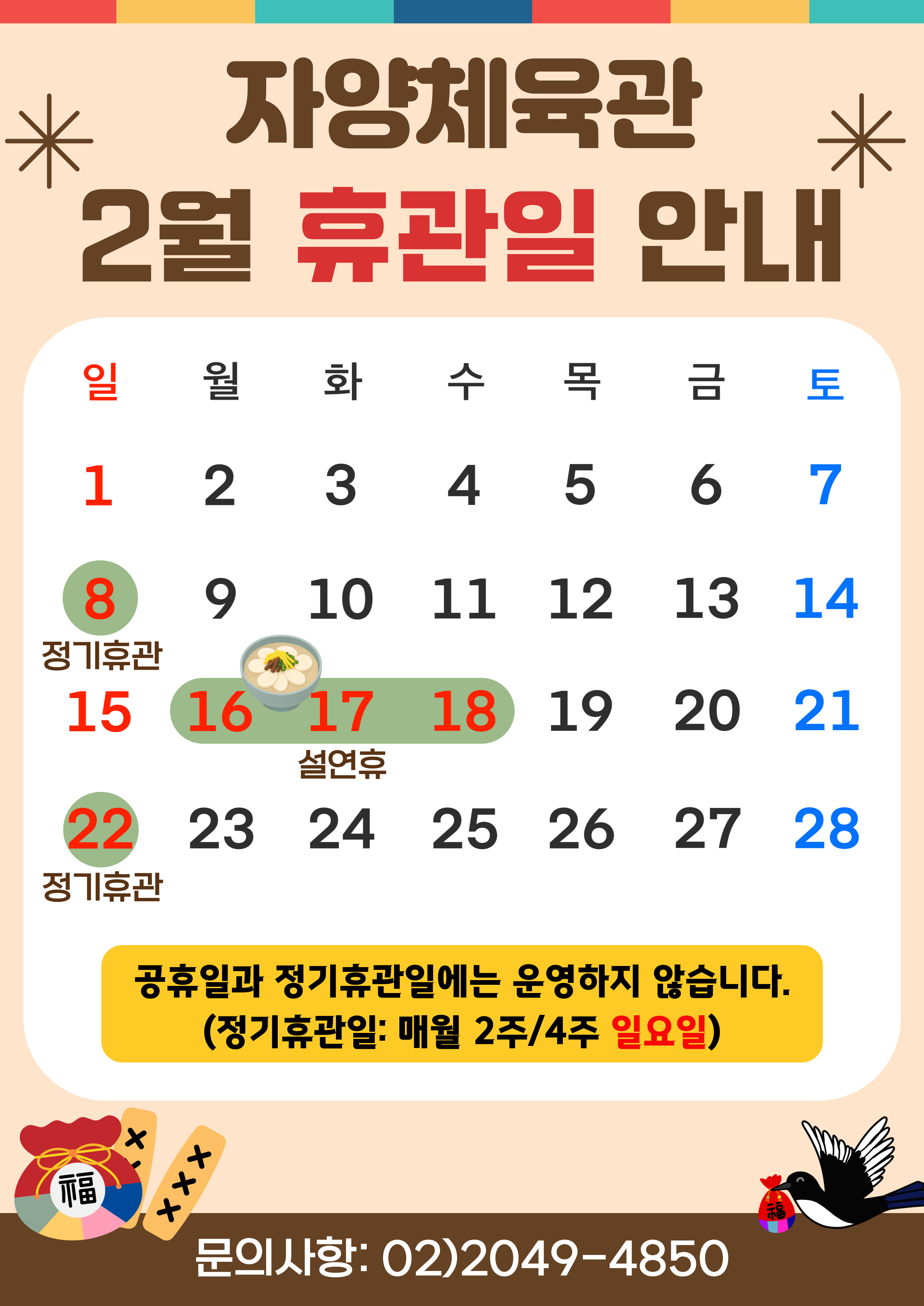 공지 자양체육관 [자양체육관] 2월 휴관일 안내 작성자 강다영 등록일자 2026년 1월 17일 13시 32분 39초 조회 16 <자양체육관 2월 휴관일 안내>휴관일: 2월 8일(일) / 2월 16일(월)~ 2월 18일(수) / 2월 22일(일)공휴일과 정기휴관일에는 운영하지 않습니다.(정기휴관일: 매월 2주, 4주 일요일)문의사항: 02)2049-4850"자세한 내용은 첨부 파일을 참고해 주세요." 2월 휴관일 안내.jpg [ Size : 1.03MB , Down : 2 ] 미리보기 다운로드 목록보기