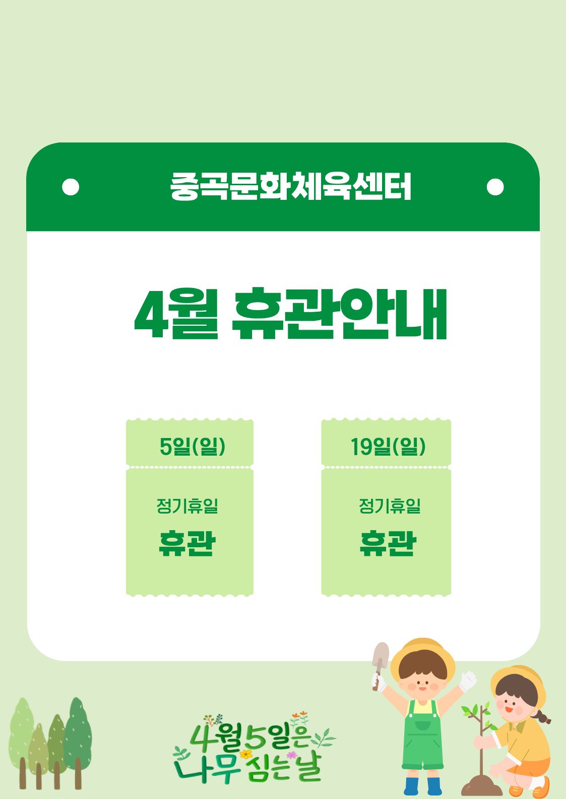 중곡문화체육센터 [중곡문화체육센터] 4월 휴관일 안내 작성자 최유리 등록일자 2026년 4월 1일 14시 33분 37초 조회 105 *4월 휴관일 안내*중곡문화체육센터 4월 휴관일은 5일, 19일 입니다.이용에 참고해주시기 바랍니다.[붙임참조] 4월 휴관일 안내.jpg [ Size : 89.3KB , Down : 44 ] 미리보기 다운로드 목록보기