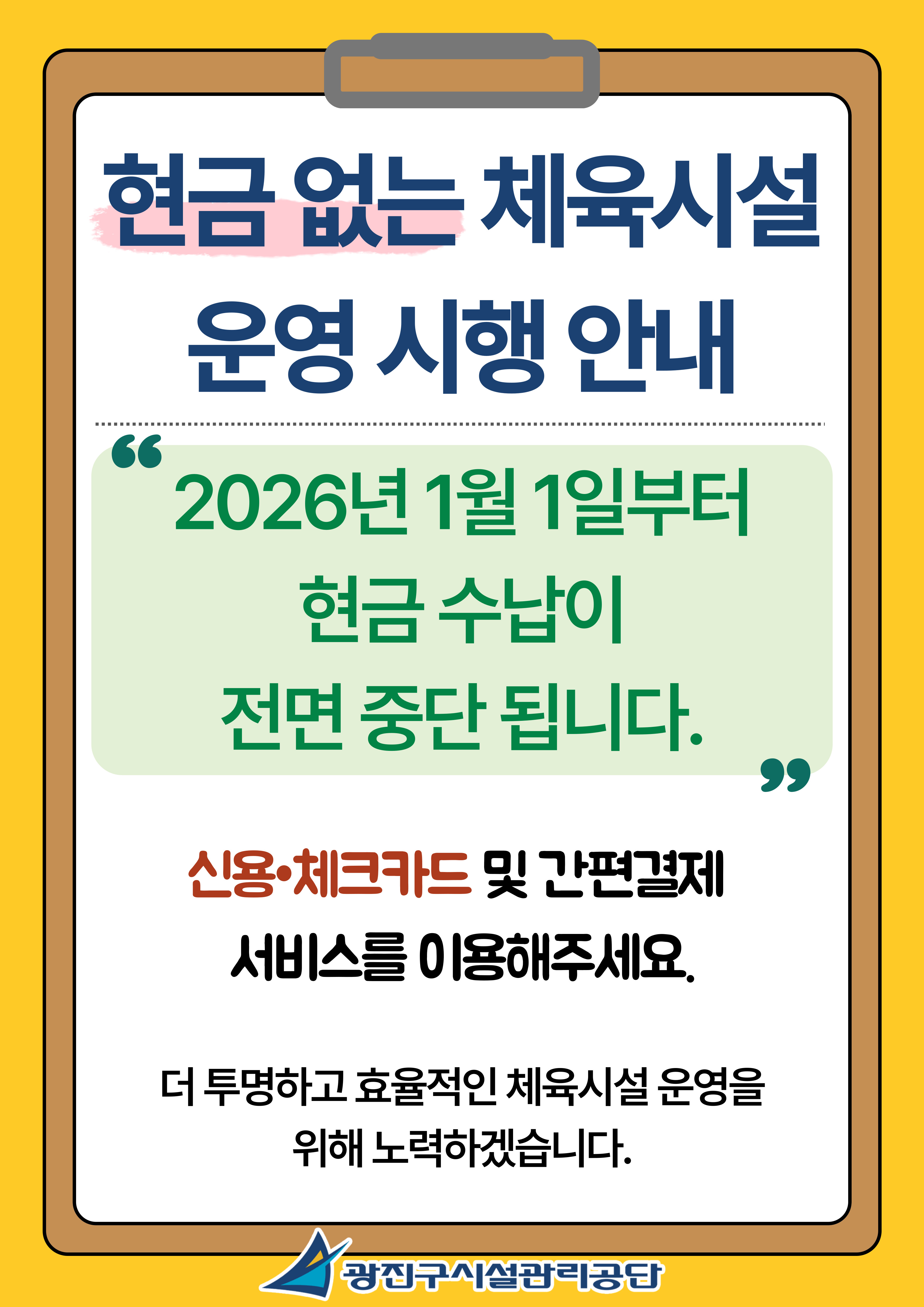 공지 광장동실내배드민턴장 현금 없는 체육시설 운영 시행 안내 작성자 이정호 등록일자 2025년 11월 20일 14시 43분 35초 조회 99 현금 없는 체육시설 운영 시행 안내 "2026년 1월 1일부터 현금 수납이 전면 중단됩니다. 신용, 체크카드 및 간편결제 서비스를 이용해주세요 더 투명하고 효율적인 체육시설 운영을 위해 노력하겠습니다. 광진구시설관리공단 현금-없는-체육시설-운영-시행-안내.jpg [ Size : 1.01MB , Down : 63 ] 미리보기 다운로드 목록보기