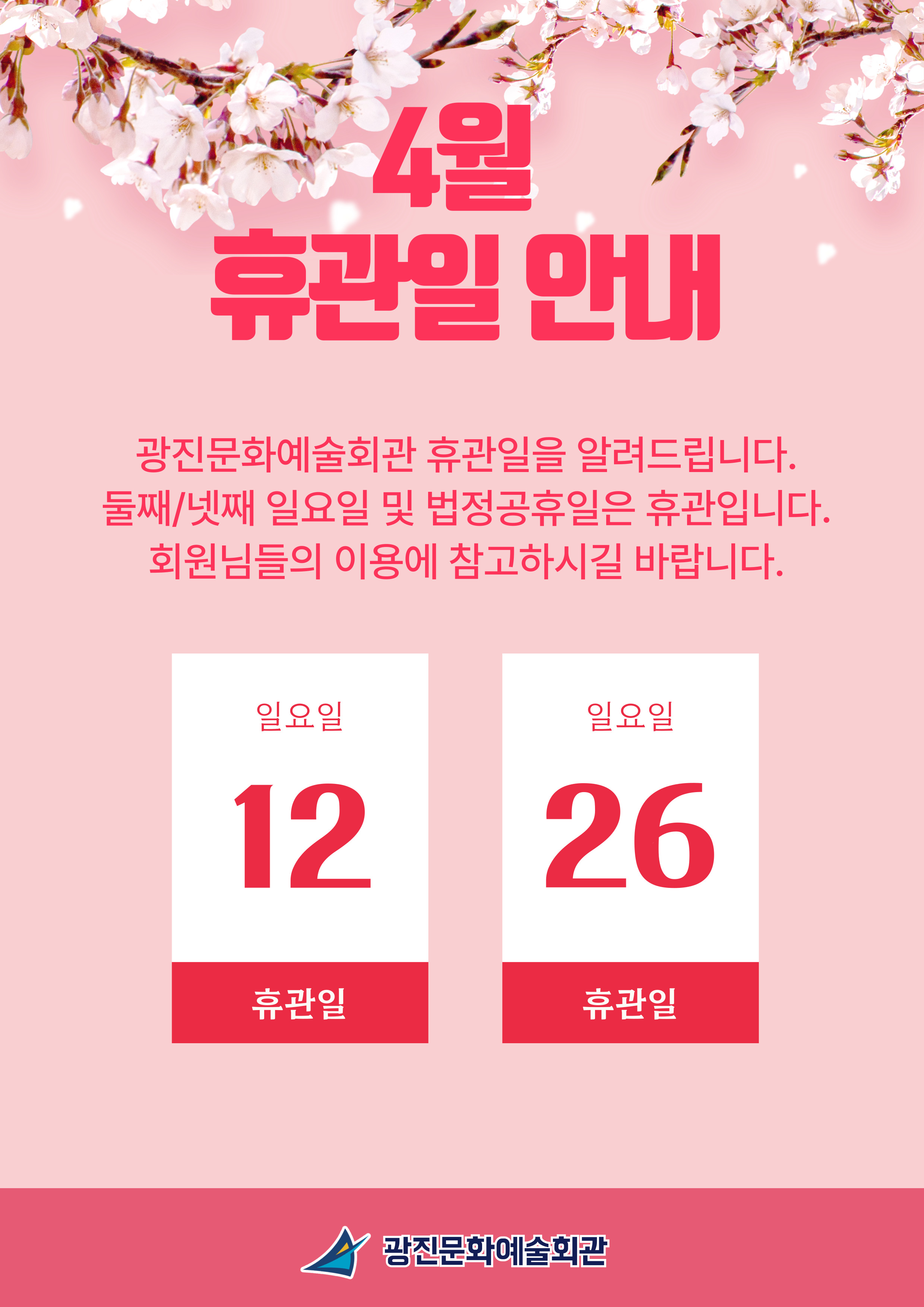 광진문화예술회관 [광진문화예술회관] 4월 휴관일 안내 작성자 문화체육부 등록일자 2026년 4월 2일 11시 35분 57초 조회 121 4월 휴관일 안내※ 자세한 내용은 첨부파일을 확인해주세요. 4월 휴관일.jpg [ Size : 803.65KB , Down : 100 ] 미리보기 다운로드 목록보기