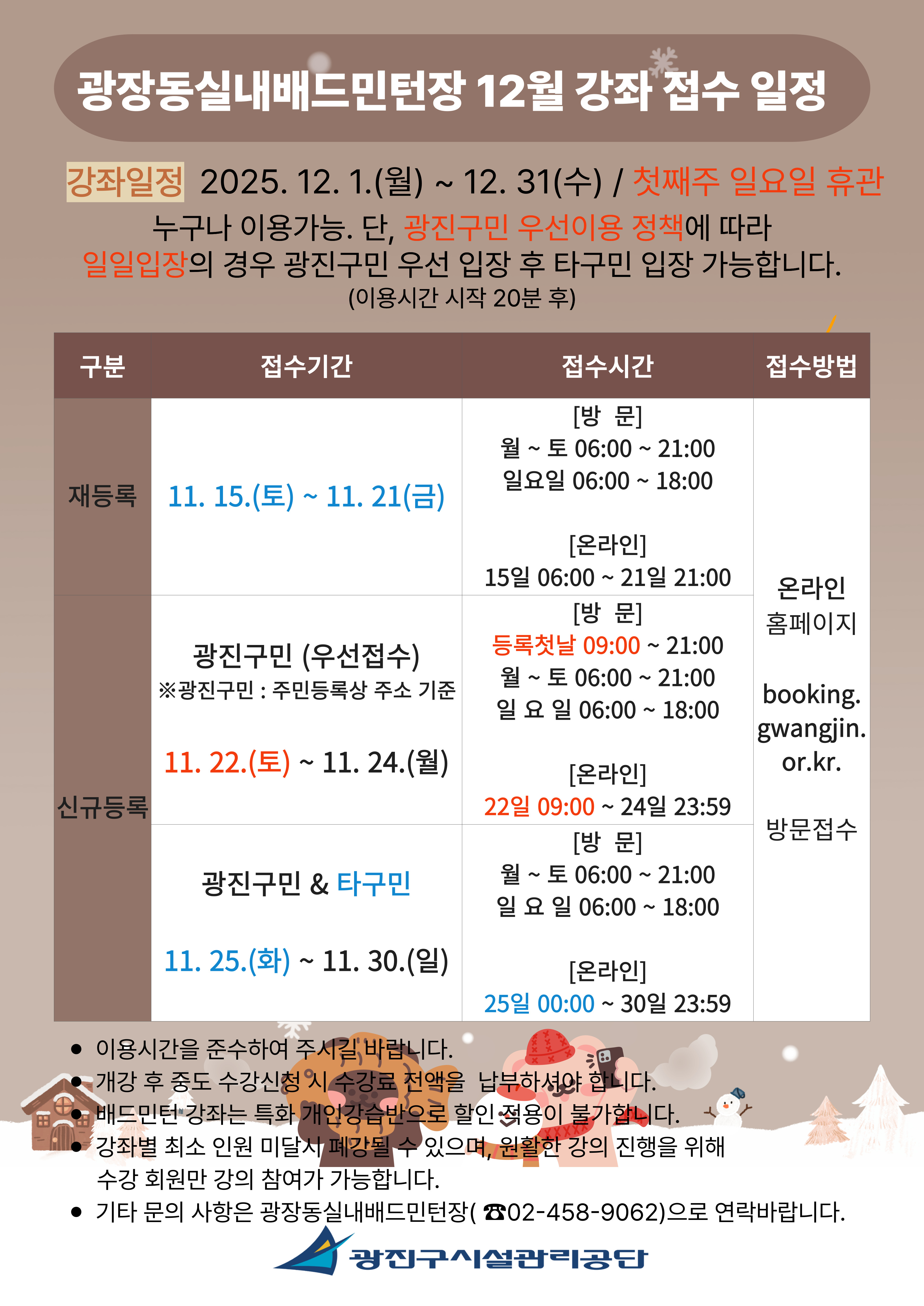 광장동실내배드민턴장 12월 강좌 접수 일정