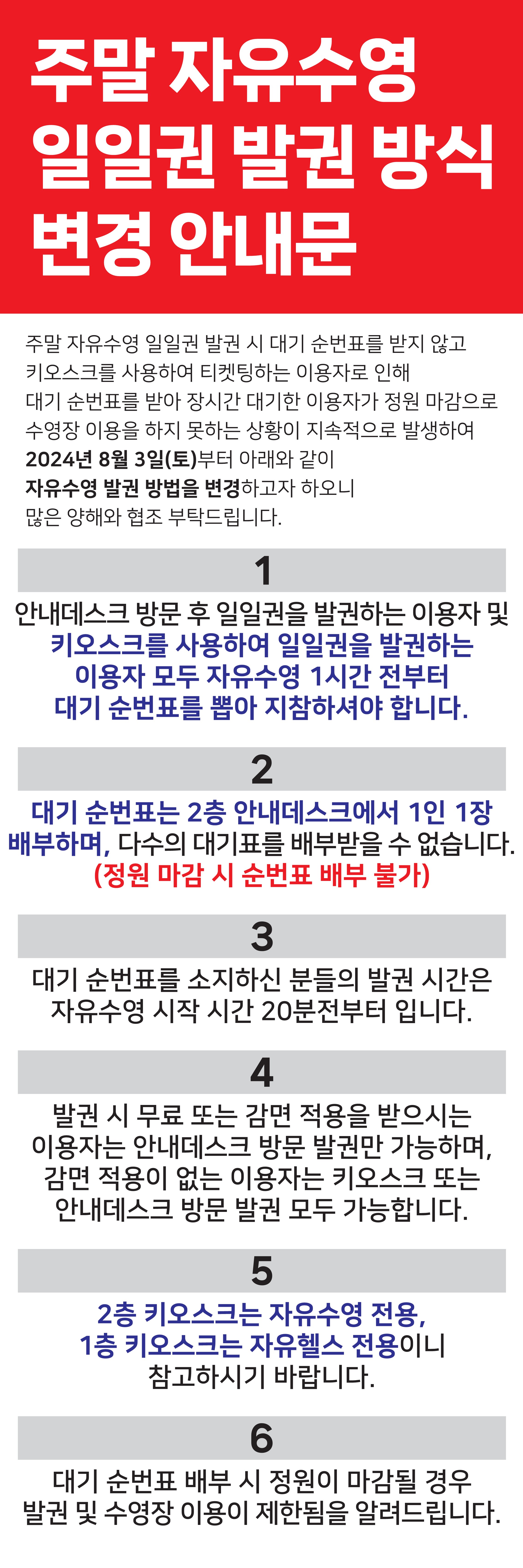 6. 대기 순번표 배부 시 정원이 마감될 경우 발권 및 수영장 이용이 제한됨을 알려드립니다.