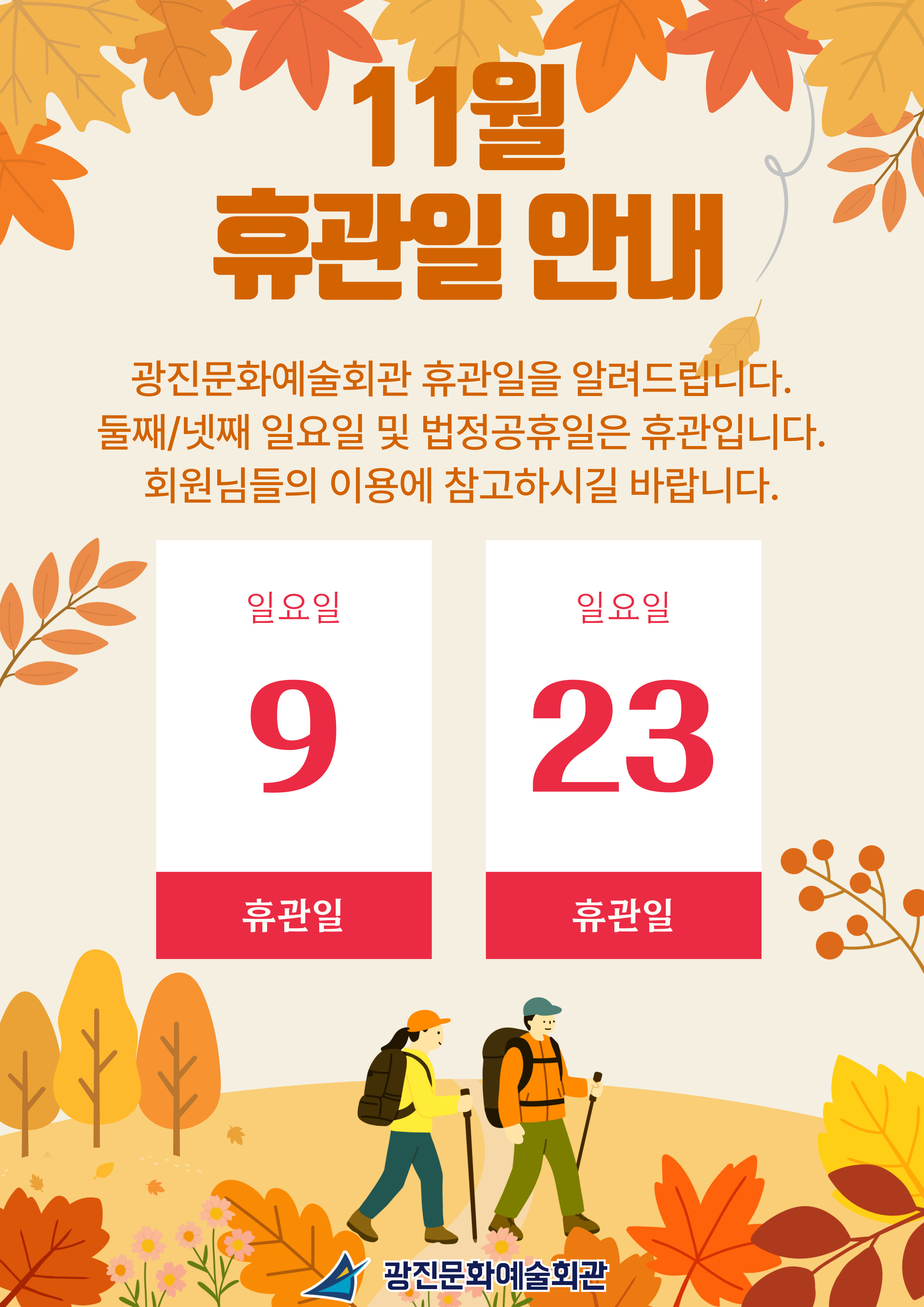 공지 광진문화예술회관 [광진문화예술회관] 11월 휴관일 안내 작성자 문화체육부 등록일자 2025년 10월 28일 16시 4분 50초 조회 520 📢 11월 휴관일 안내광진문화예술회관은 둘째·넷째 일요일 및 법정공휴일에 휴관합니다.11월 휴관일은 아래와 같습니다.11월 9일(일)11월 23일(일)회원 여러분의 이용에 참고하시기 바랍니다.자세한 내용은 붙임파일을 참고해주세요.감사합니다. 11월 휴관일.jpg [ Size : 900.87KB , Down : 92 ] 미리보기 다운로드 목록보기