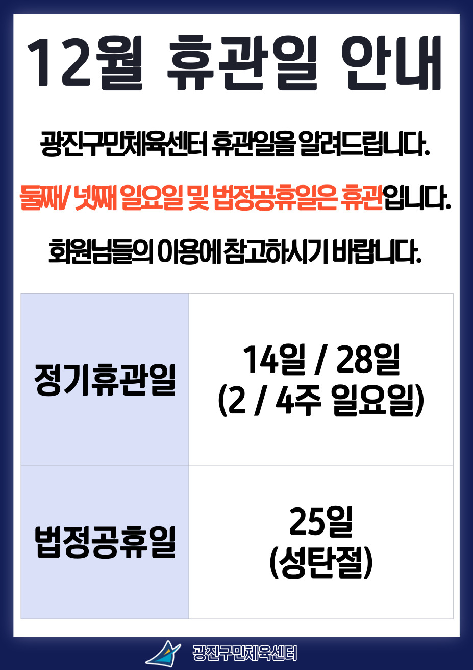 공지 광진구민체육센터 [광진구민체육센터] 12월 휴관일 안내 작성자 한병우 등록일자 2025년 11월 25일 14시 28분 49초 조회 206 광진구민체육센터 휴관일을 알려드립니다.둘째/넷째 일요일 및 법정공휴일은 휴관입니다.회원님들의 이용에 참고하시기 바랍니다.정기휴관일 : 14일 / 28일 (2/4주 일요일)법정공휴일 : 25일 (성탄절)"자세한 내용은 첨부 파일을 참고해 주세요." 휴관일.jpg [ Size : 197.11KB , Down : 36 ] 미리보기 다운로드 목록보기