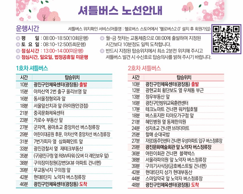 공지 광진구민체육센터 [광진구민체육센터] 셔틀버스 노선 안내 작성자 이혜연 등록일자 2026년 1월 28일 18시 52분 37초 조회 33 셔틀버스 노선도 안내다운로드하여 확인하시기 바랍니다. 셔틀버스 노선안내.jpg [ Size : 202KB , Down : 21 ] 미리보기 다운로드 목록보기