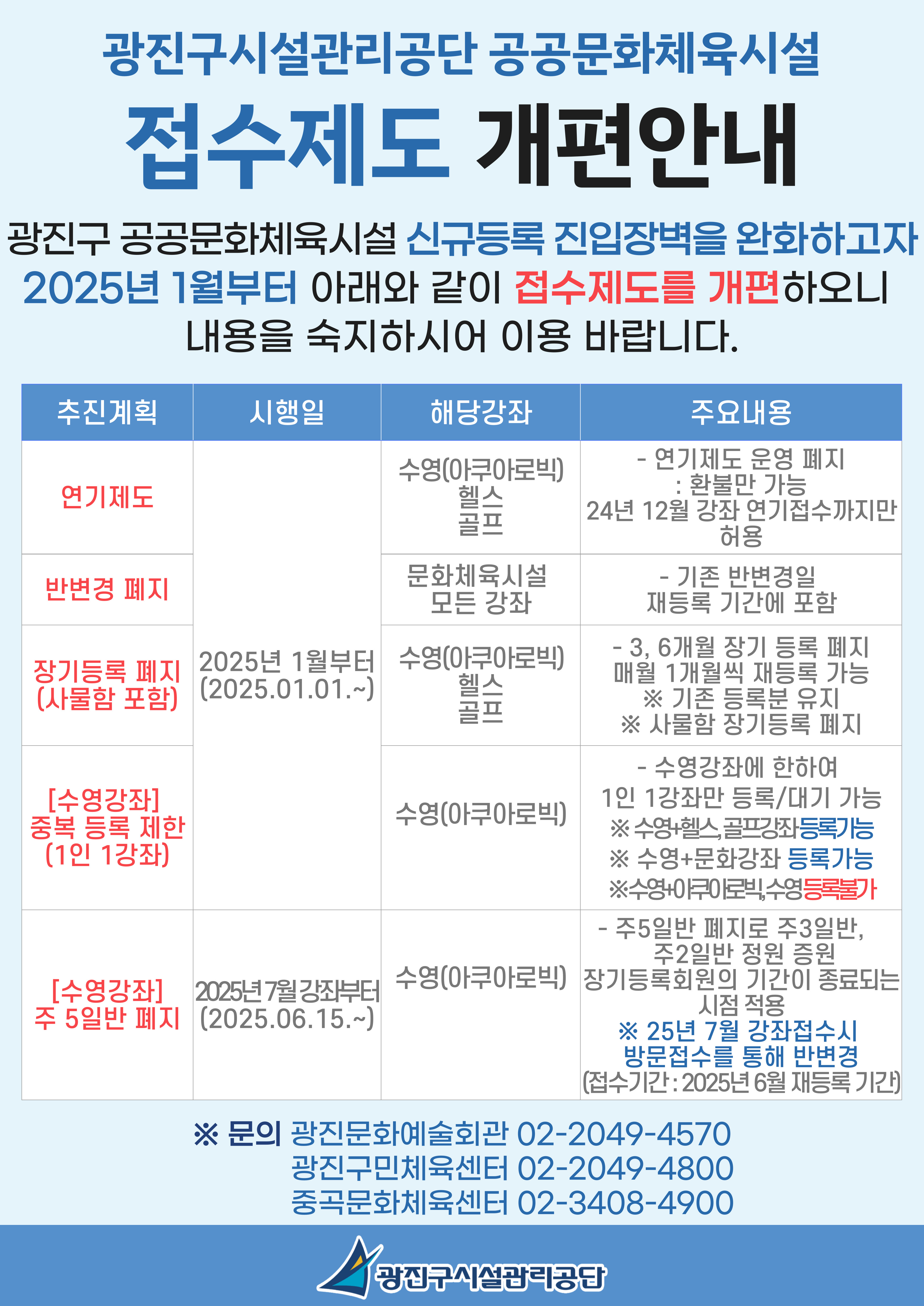 2025년 1월부터 광진구 공공문화체육시설 신규 등록 진입장벽을 완화하고자 2025년 1월부터 아래와 같이 접수제도를 개편하오니 내용을 숙지하시어 이용 바랍니다.