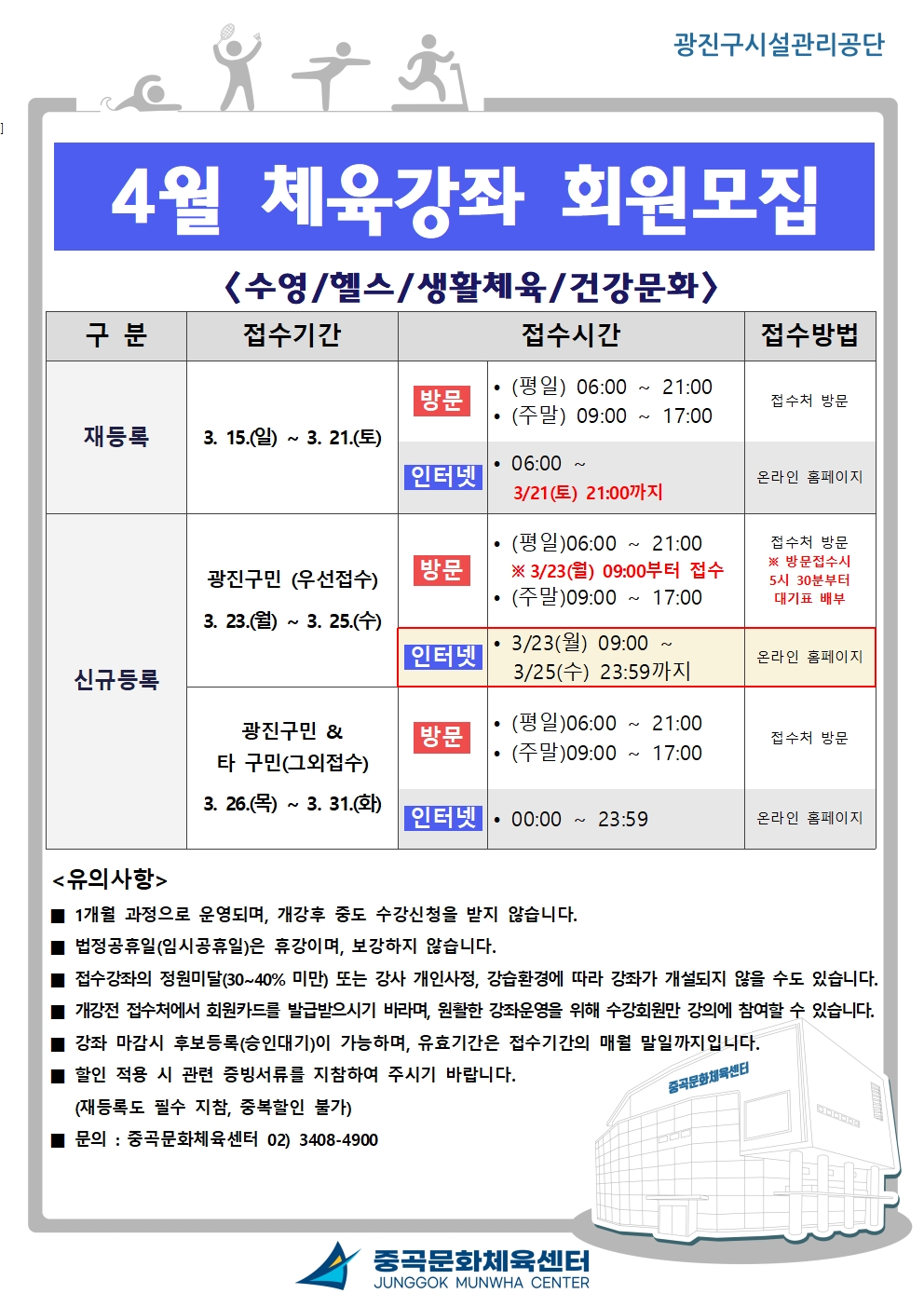 신규등록 : [광진구민 우선접수 3. 23.(월) ~ 3. 31.(화)]