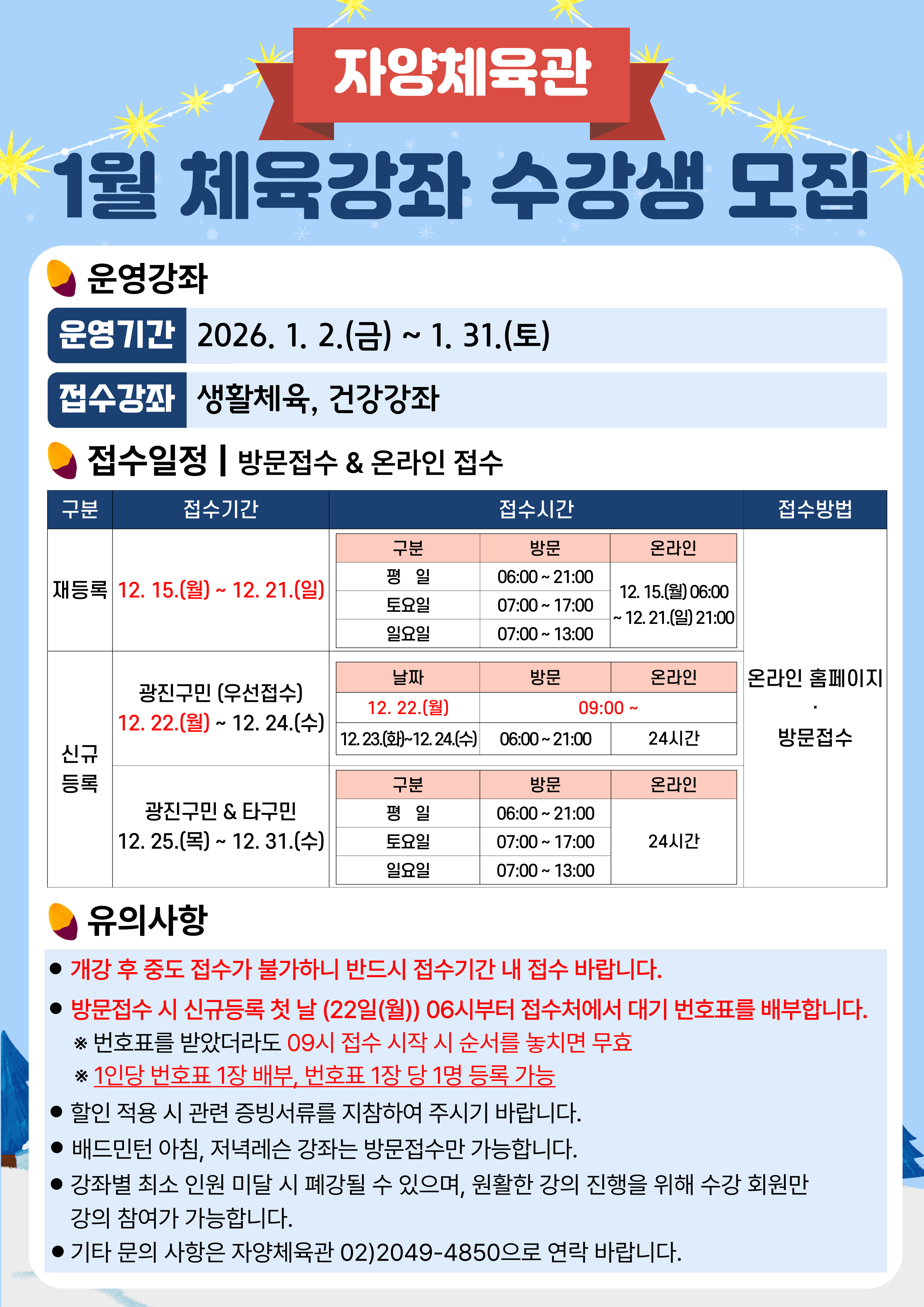 - 기타 문의 사항은 자양체육관 02)2049-4850으로 연락 바랍니다.