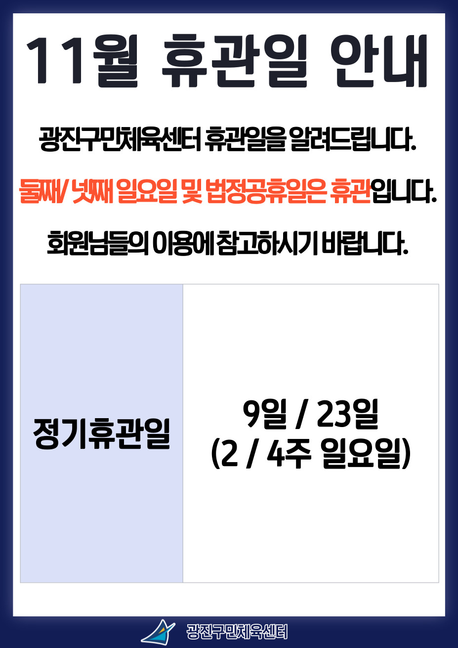 공지 광진구민체육센터 [광진구민체육센터] 11월 휴관일 안내 작성자 한병우 등록일자 2025년 10월 28일 16시 58분 0초 조회 135 광진구민체육센터 휴관일을 알려드립니다.둘째/넷째 일요일 및 법정공휴일은 휴관입니다.회원님들의 이용에 참고하시기 바랍니다.정기휴관일 : 9일 / 23일 (2/4주 일요일)"자세한 내용은 첨부 파일을 참고해 주세요." 휴관일(1).jpg [ Size : 174.09KB , Down : 41 ] 미리보기 다운로드 목록보기