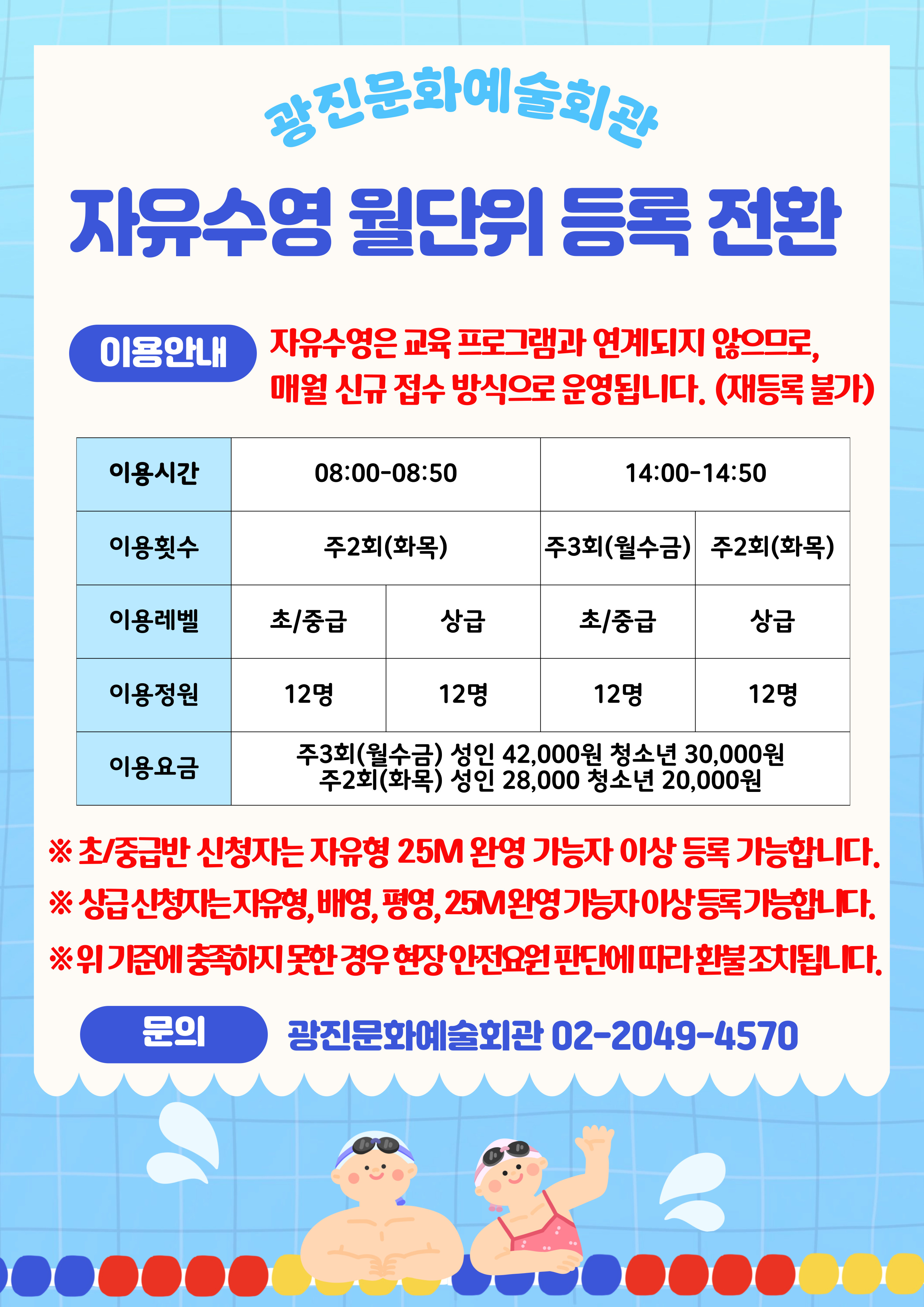 공지 광진문화예술회관 [광진문화예술회관] 자유수영 월단위 강좌 전환 안내