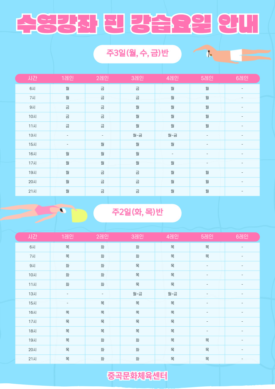 공지 중곡문화체육센터 [중곡문화체육센터] 수영강좌 핀 강습요일 안내 작성자 정선아 등록일자 2025년 6월 25일 9시 58분 9초 조회 1,182 [중곡문화체육센터] 수영강좌 핀 강습요일 안내입니다.수영강좌 주3회(월, 수, 금) 및 주2회(화, 목) 강좌 핀 강습요일을 첩부하오니,자세한 내용은 첨부파일을 참고해 주시기 바랍니다. 수영강좌-핀-강습요일-안내-001 (1).jpg [ Size : 213.7KB , Down : 817 ] 미리보기 다운로드 목록보기