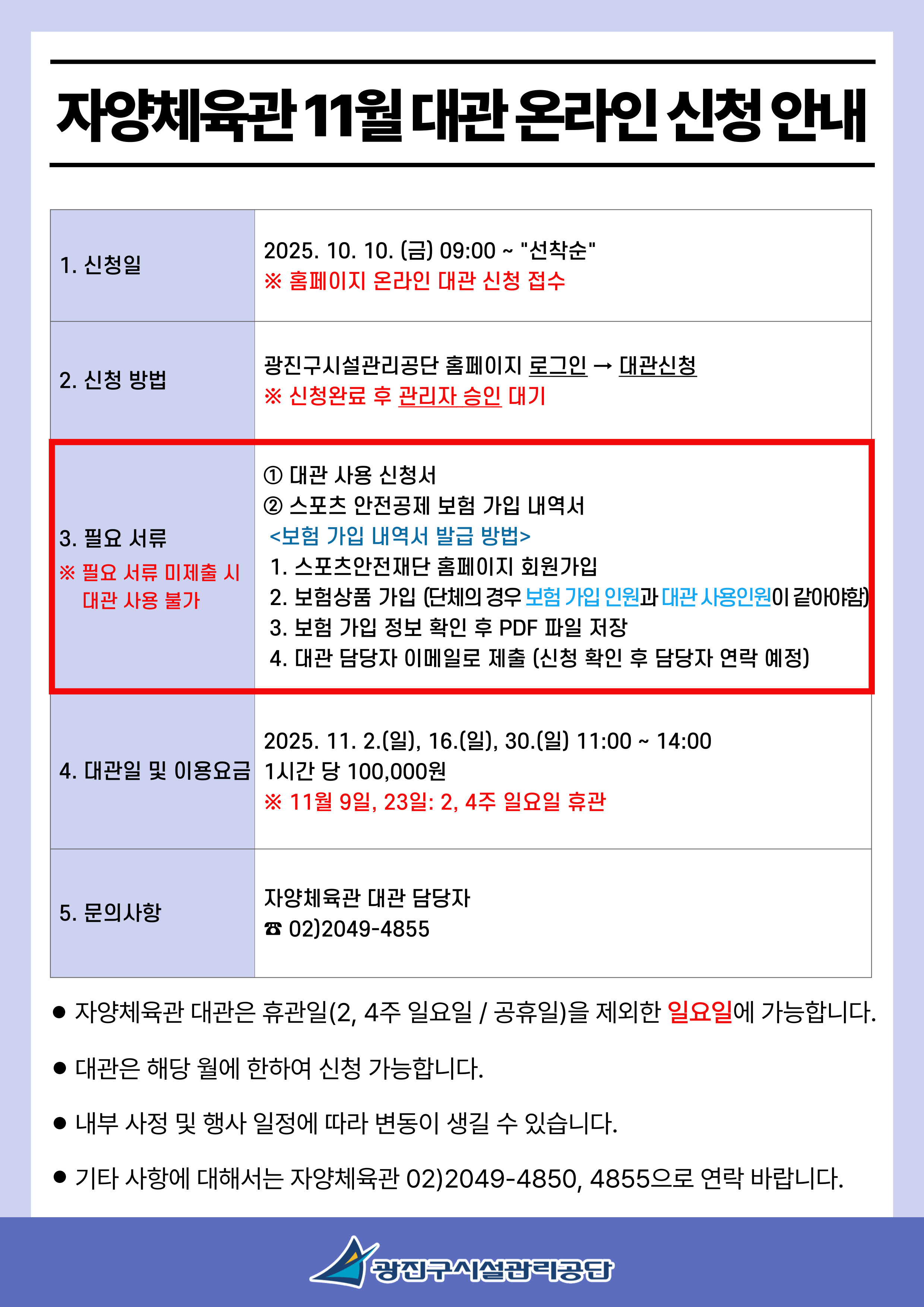 공지 자양체육관 [자양체육관] 11월 대관 온라인 신청 안내