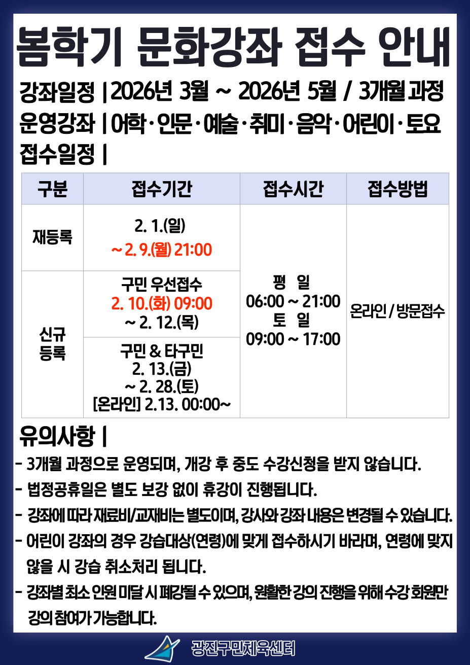 공지 광진구민체육센터 [광진구민체육센터] 2026년 봄학기 문화강좌 접수 안내 작성자 이혜연 등록일자 2026년 1월 30일 18시 8분 36초 조회 55 재등록 : 2.1.(일) ~ 2.9.(월) 21:00신규등록 - 구민우선 : 2.10.(화) 09:00 ~ 2.12.(목)- 구민&타구민 : 2.13.(금) ~ 2.28.(토) [온라인] 2.13. 00:00~"자세한 내용은 첨부 파일을 참고해 주세요." 봄학기.jpg [ Size : 281.55KB , Down : 24 ] 미리보기 다운로드 목록보기