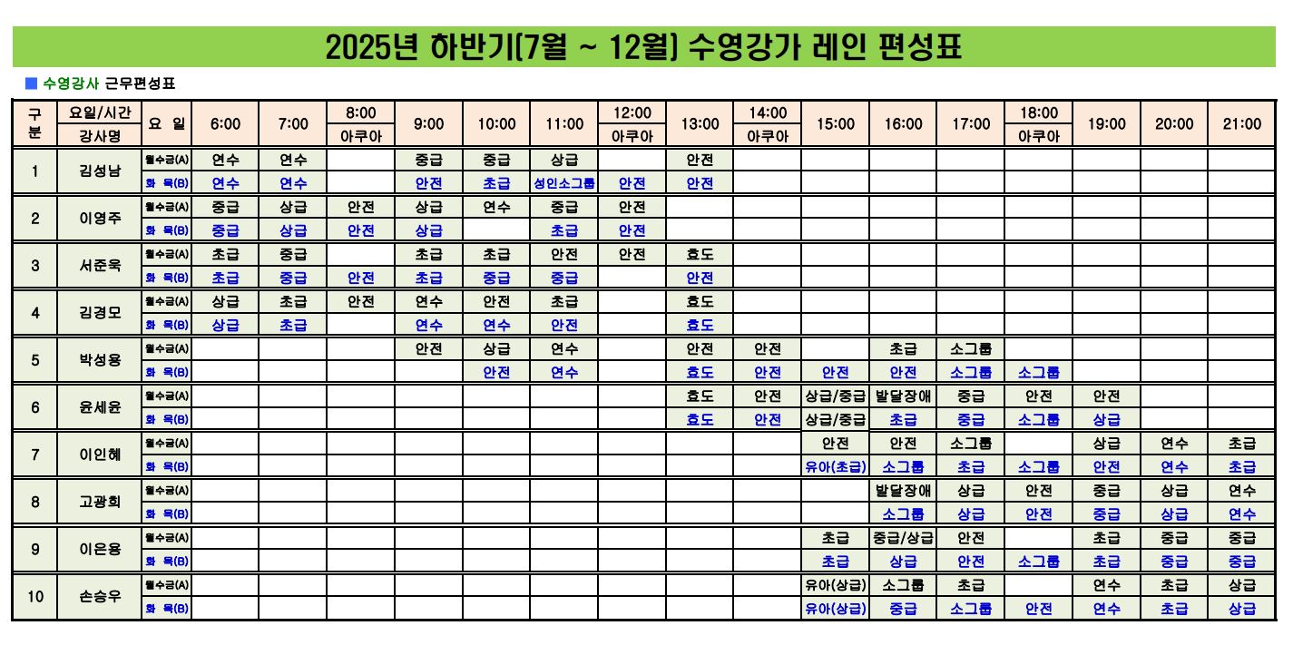 공지 중곡문화체육센터 [중곡문화체육센터] 7월~12월 수영강사 레인 편성표 작성자 서연숙 등록일자 2025년 6월 25일 9시 59분 9초 조회 1,565 [중곡문화체육센터] 수영강사 레인 편성표 안내입니다.2025년 하반기(7월~8월) 수영강세 레인 편성표를 첨부하오니,자세한 내용은 첨부파일을 참고해 주시기 바랍니다. 2025년 하반기 수영강사 레인 편성표.JPG [ Size : 219.75KB , Down : 497 ] 미리보기 다운로드 목록보기