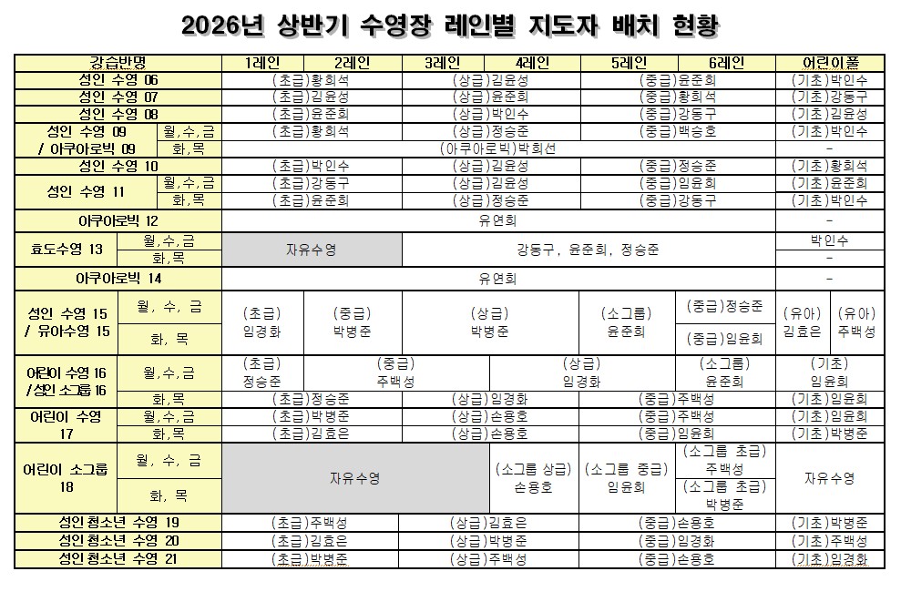 공지 광진구민체육센터 [광진구민체육센터] 2026년 상반기 수영장 레인별 지도자 배치 현황 작성자 한병우 등록일자 2025년 12월 29일 13시 46분 5초 조회 420 2026년 상반기 수영장 레인별 지도자 배치 현황다운로드하여 확인하시기 바랍니다. 2026상반기수영장.jpg [ Size : 219.03KB , Down : 332 ] 미리보기 다운로드 목록보기
