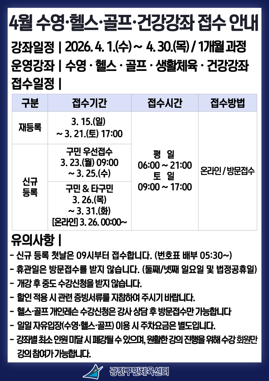 광진구민체육센터 [광진구민체육센터] 2026년 4월 수영, 헬스, 골프, 건강강좌 접수 안내