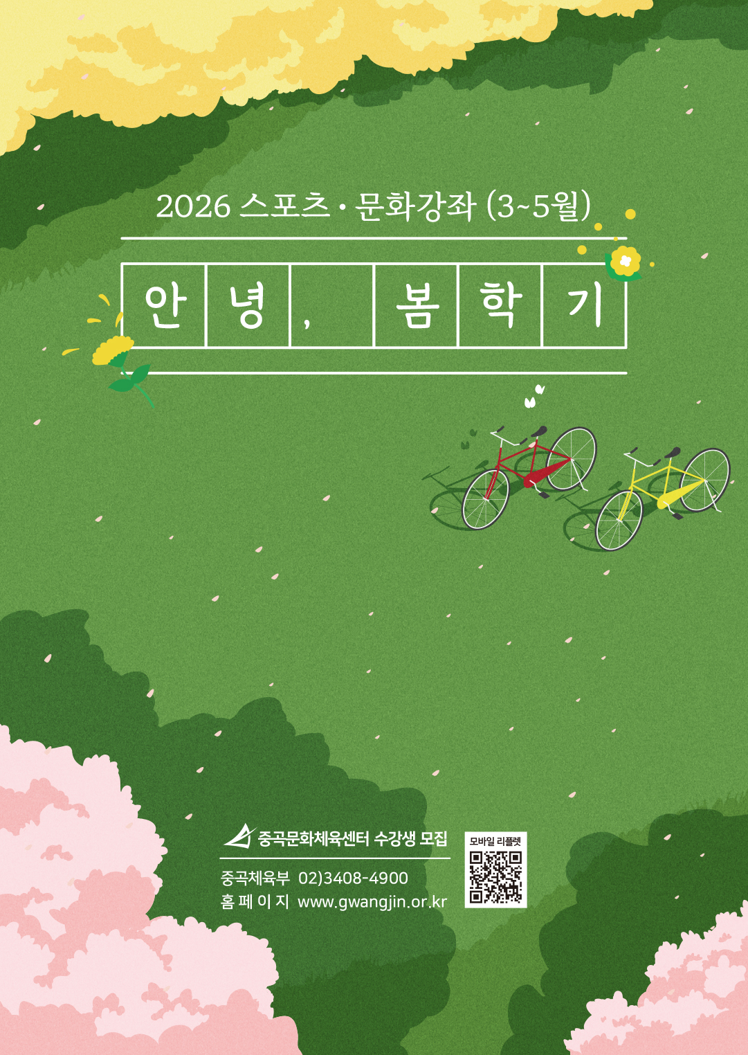 중곡문화체육센터 [중곡문화체육센터] 봄학기 모바일 리플릿 안내 작성자 최유리 등록일자 2026년 1월 27일 15시 41분 14초 조회 24 2026년 봄학기 모바일 리플릿 안내붙임참조 2026_0122_중곡문화체육센터_26년 봄학기 프로그램_시안파일-1 복사.jpg [ Size : 1.34MB , Down : 28 ] 미리보기 다운로드 목록보기