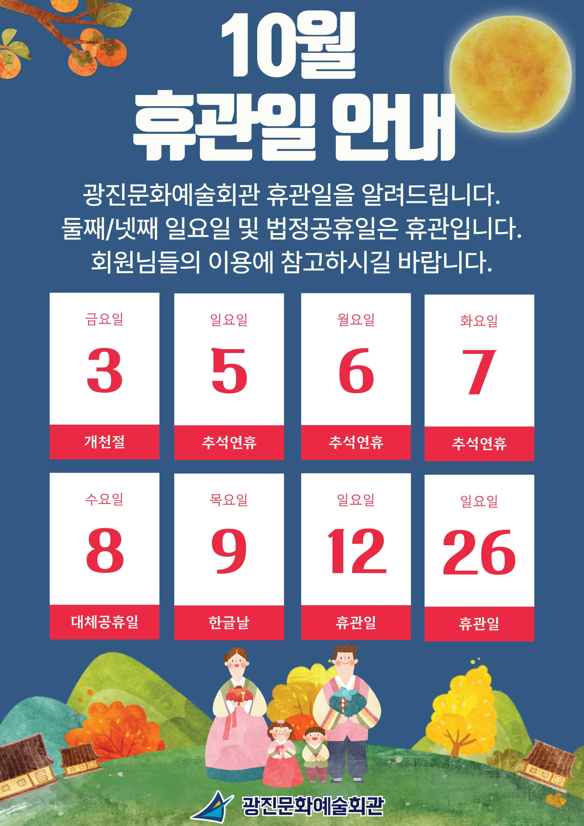 공지 광진문화예술회관 [광진문화예술회관] 10월 휴관일 안내 작성자 문화체육부 등록일자 2025년 9월 23일 15시 3분 40초 조회 840 광진문화예술회관 10월 휴관일 안내입니다.10월 3일 개천절, 10월 5일 ~ 7일 추석연휴, 8일 대체 공휴일, 9일 한글날이며, 10월 12일과 26일은 정기휴관 입니다. 이용에 참고 바랍니다."자세한 내용은 첨부 파일을 참고해 주세요." 10월 휴관일.jpg [ Size : 1.17MB , Down : 368 ] 미리보기 다운로드 목록보기