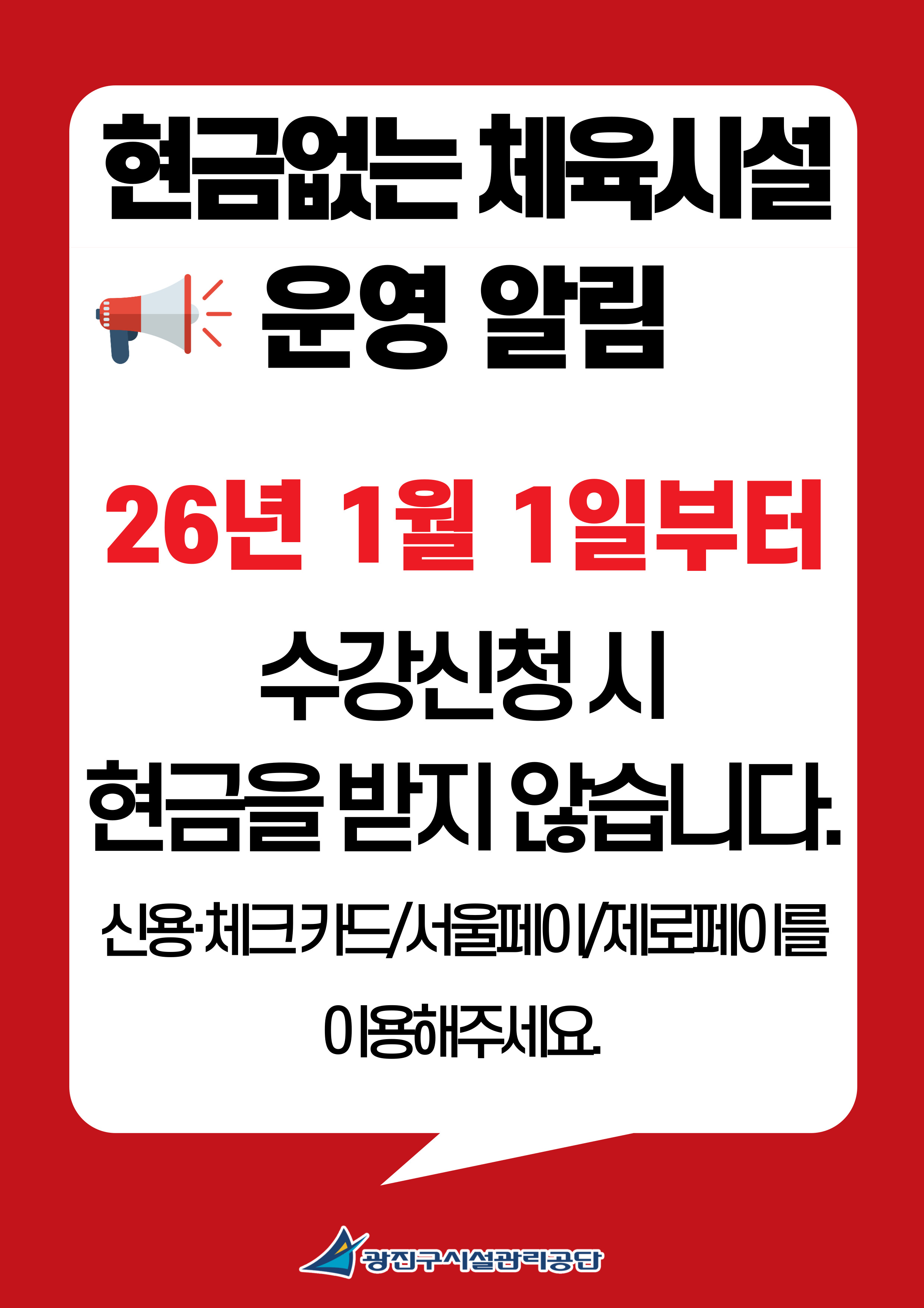 광진구시설관리공단 광진문화예술회관은 더 투명하고 효율적인 체육시설 운영을 위해 2026년 1월 1일부터 ‘현금 없는 체육시설 운영’을 전면 시행합니다.