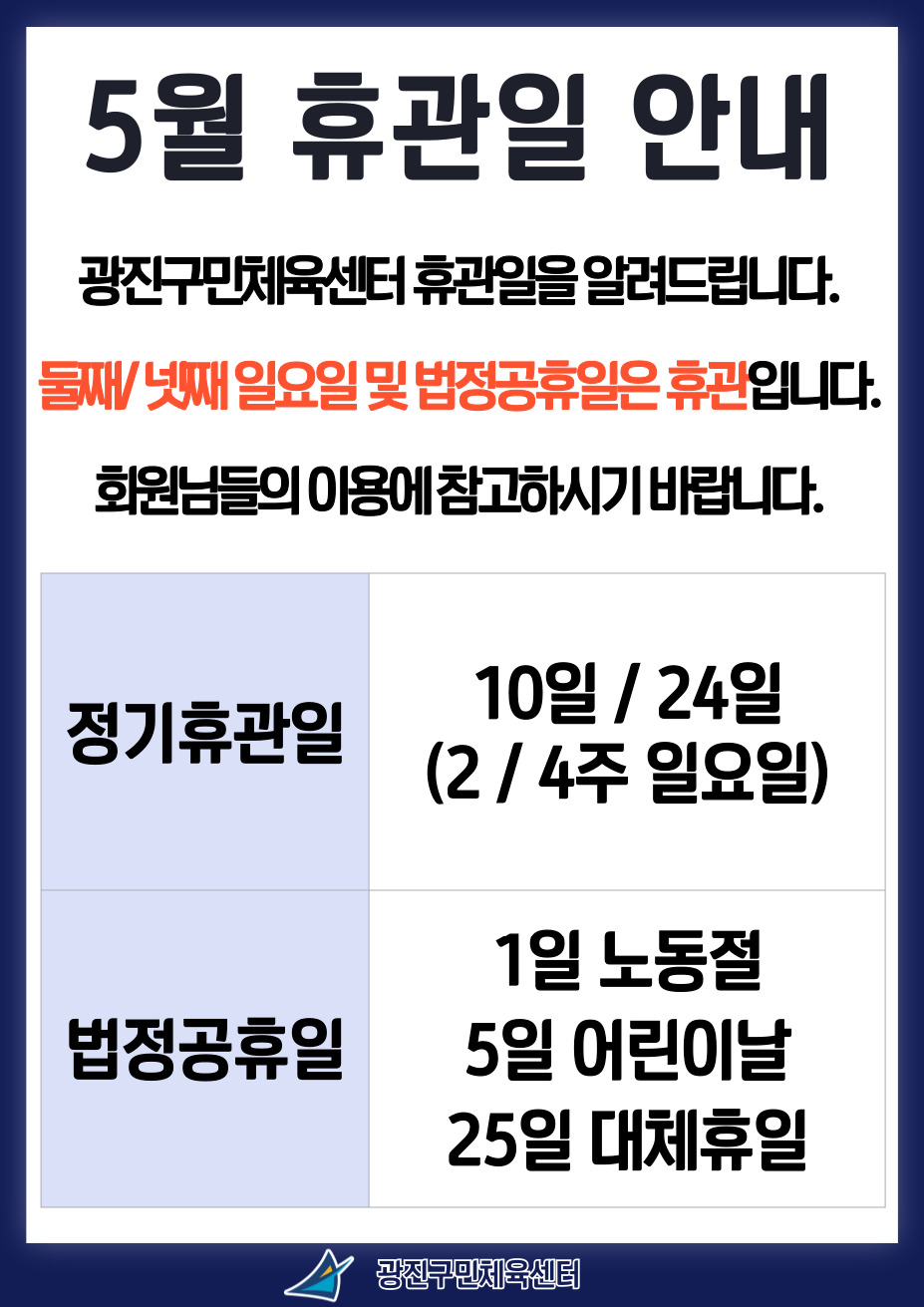 광진구민체육센터 [광진구민체육센터] 5월 휴관일 안내 작성자 이혜연 등록일자 2026년 4월 27일 17시 24분 46초 조회 51 광진구민체육센터 휴관일을 알려드립니다.둘째/넷째 일요일 및 법정공휴일은 휴관입니다.회원님들의 이용에 참고하시기 바랍니다.정기휴관일 : 10일 / 24일 (2/4주 일요일)법정공휴일 : 1일(노동절) / 5일(어린이날) / 25일(대체휴일)"자세한 내용은 첨부 파일을 참고해 주세요." 5월 휴관일.jpg [ Size : 208.8KB , Down : 12 ] 미리보기 다운로드 목록보기