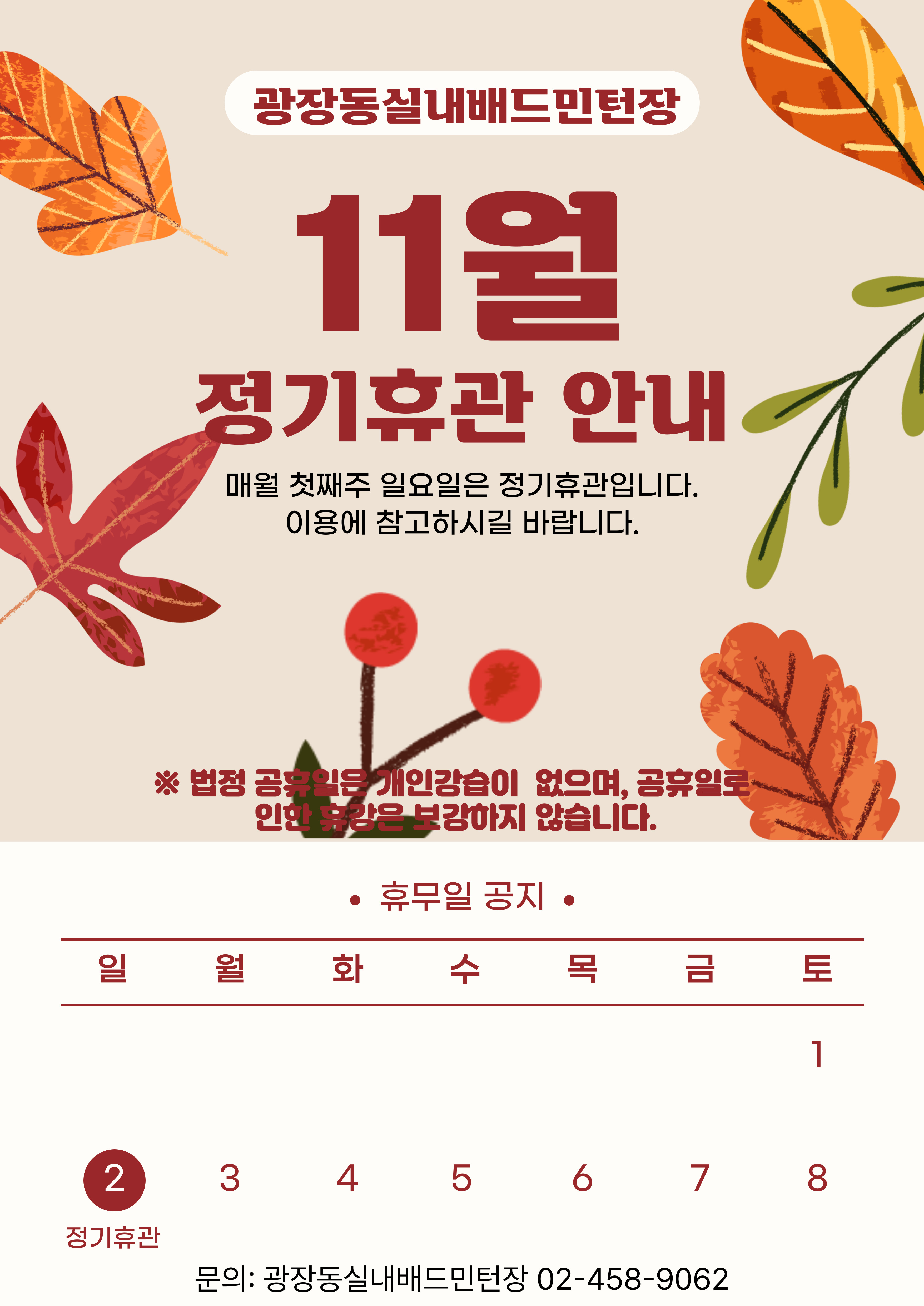 공지 광장동실내배드민턴장 2025년 11월 휴관일 안내 작성자 이정호 등록일자 2025년 10월 17일 14시 15분 23초 조회 115 광장동실내배드민턴장11월 휴관일 안내정기휴관11월 2일 일요일매월 첫째주 일요일은 정기휴관입니다.이용에 참고하시길 바랍니다.※ 법정 공휴일은 개인강습이 없으며, 공휴일로 인한 휴강은 보강하지 않습니다."자세한 내용은 첨부 파일을 참고해 주세요." 11월 휴관안내.jpg [ Size : 1.19MB , Down : 16 ] 미리보기 다운로드 목록보기