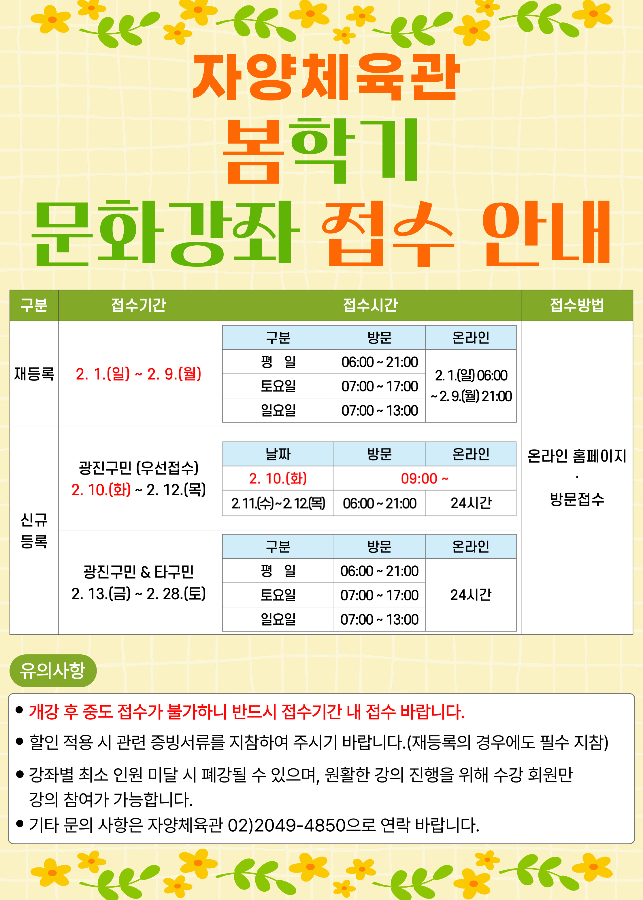 자양체육관 [자양체육관] 봄학기 문화강좌 접수 안내 작성자 강다영 등록일자 2026년 2월 5일 15시 19분 24초 조회 75 <자양체육관 봄학기 문화강좌 접수 안내>○ 재등록: 2. 1.(일) ~ 2. 9.(월)○ 신규등록(관내): 2. 10.(화) ~ 2. 12.(목)○ 신규등록(관외): 2. 13.(금) ~ 2. 28.(토)○ 접수방법: 온라인홈페이지 & 방문접수※ 자세한 내용은 첨부파일 참고 바랍니다. 봄학기 문화강좌 접수 안내.jpg [ Size : 938.51KB , Down : 15 ] 미리보기 다운로드 목록보기