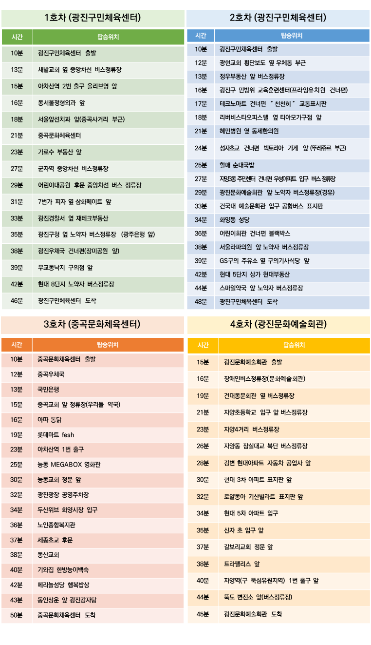 [광진구시설관리공단 셔틀버스 이용 안내] ○ 운행시간 : 평일 08:00 ~ 18:50(10회 운행), 토요일 08:00 ~ 12:50(5회 운행) ※ 평일 점심시간(13:00 ~ 14:00), 일요일, 법정공휴일은 운행하지 않습니다. ※ 2호차의 경우 평일 첫차는 08:00시에 출발하여 지정된 시간보다 각 정류장에 10분 정도 일찍 도착합니다. ※ 3호차의 경우 08:00시 첫차 운행만 “한전부지 임시 공영주차장”에서 출발합니다. ○ 어린이 회원은 승‧하차가 익숙해질 때까지 보호자께서 동승하여 주시기 바랍니다. ○ 셔틀버스 이용시 정해진 시간보다 5분 정도 일찍 나오시기 바랍니다. ○ 셔틀버스의 원활한 운행을 위하여 지정된 장소에서만 승‧하차 하시기 바랍니다. ○ 차량 접근시 ‘손을 들어’ 차량 이용 탑승객임을 표시하여 주시기 바랍니다. ○ 셔틀버스 도착시간 보다 15분 이상 지연될 경우 도로사정, 차량 정체 등으로 인한 지연이오니 가급적 다른 교통수단을 이용해 주시기 바랍니다. |